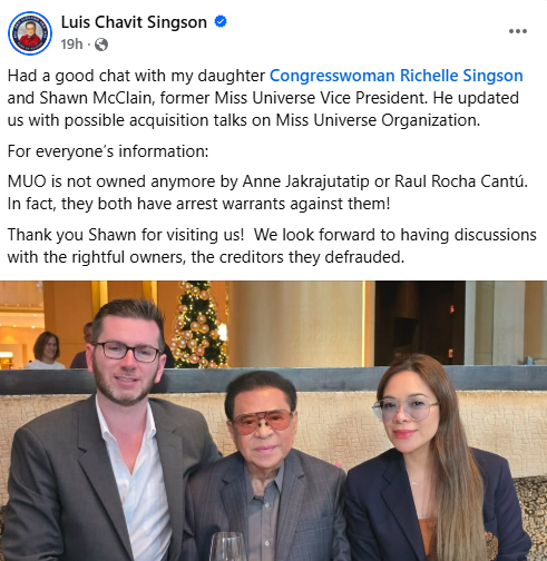 "Had a good chat with my daughter Congresswoman Richelle Singson and Shawn McClain, former Miss Universe Vice President. He updated us with possible acquisition talks on Miss Universe Organization," ani Singson sa kaniyang social media post.