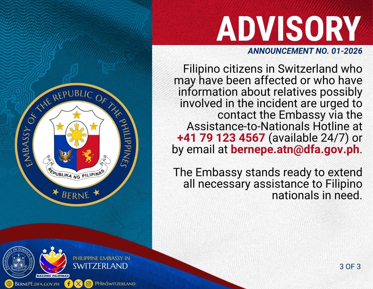 “Filipino citizens in Switzerland who may have been affected or who have information about relatives possibly involved in the incident are urged to contact the Embassy via the Assistance-to-Nationals Hotline at +41 79 123 4567 (available 24/7) or by email at [email protected],” abiso ng Embahada.