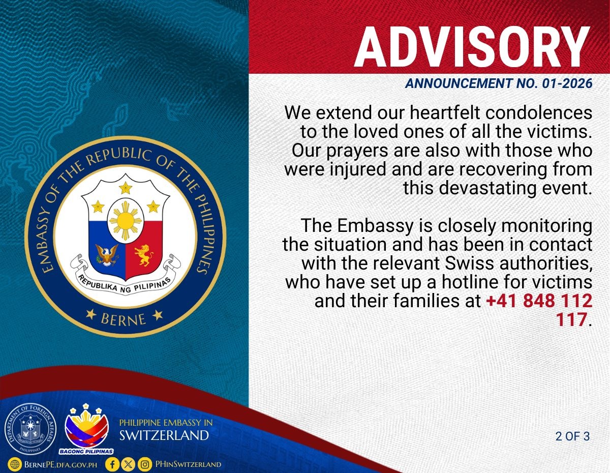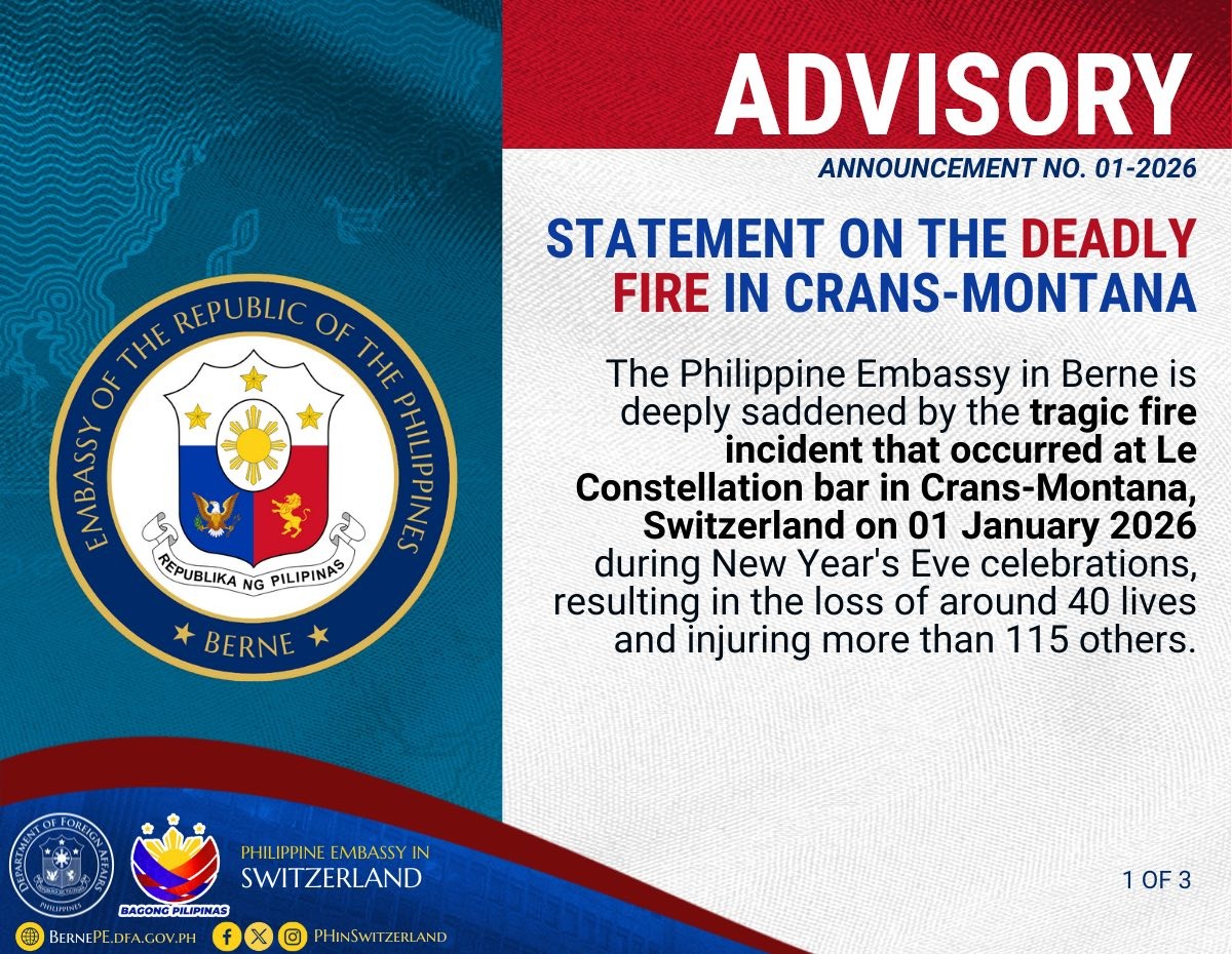 “The Philippine Embassy in Berne is deeply saddened by the traffic fire incident that occurred at Le Constellation bar in Crans-Montana, Switzerland on 01 January 2026 during New Year’s Eve celebrations, resulting in the loss of around 40 lives and injuring more than 115 others,” saad ng Embahada sa kanilang pahayag noong Biyernes, Enero 2.