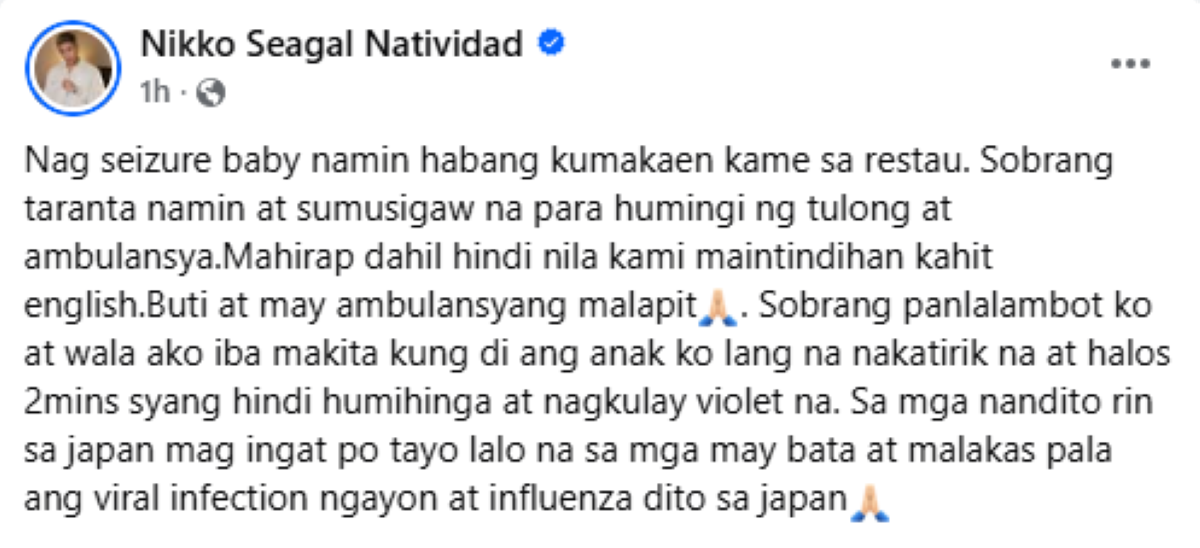 Sa kaniyang social media post nitong Sabado, Enero 3, ikinuwento ni Nikko ang matinding taranta at takot na kanilang dinanas nang bigla umanong tumirik ang mga mata at halos hindi makahinga ang kanilang anak sa loob ng halos dalawang minuto.