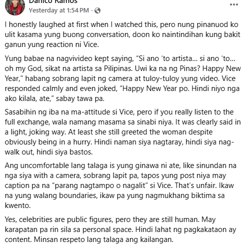 Yung babae na nagvivideo kept saying, 'Si ano ‘to artista… si ano ‘to… oh my God, sikat na artista sa Pilipinas. Uwi ka na ng Pinas? Happy New Year,” habang sobrang lapit ng camera at tuloy-tuloy yung video. Vice responded calmly and even joked, 'Happy New Year po. Hindi niyo nga ako kilala, ate,' sabay tawa pa."