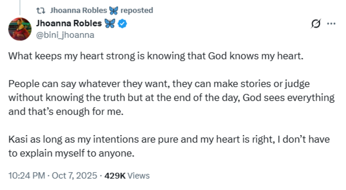 Bagama't wala pang direktang opisyal na pahayag tungkol sa isyu, usap-usapan naman ng mga netizen ang pag-repost ni Jhoanna sa lumang X post niya noong Oktubre 2025.