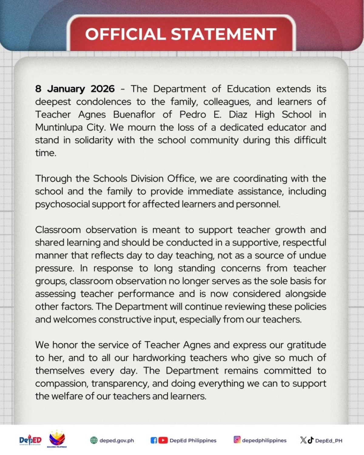 Sa pagtatapos ng pahayag, kinilala ng ahensya ang serbisyo ni Teacher Agnes at nagbigay pasasalamat sa pagsasakripisyo ng iba pang mga guro sa ngalan ng edukasyon at pagtuturo.