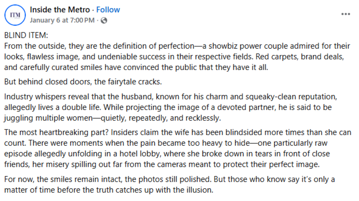 Usap-usapan ang blind item na inilathala ng social media page na "Inside the Metro" noong Enero 6, 2026 patungkol sa isang sikat na "power couple" na umano'y tila perfect ang relasyon sa mata ng publiko, subalit ang katotohanan daw, malapit na raw mauwi sa hiwalayan dahil sa umano'y side chicks ng male celebrity na hindi naman lingid sa female celebrity.