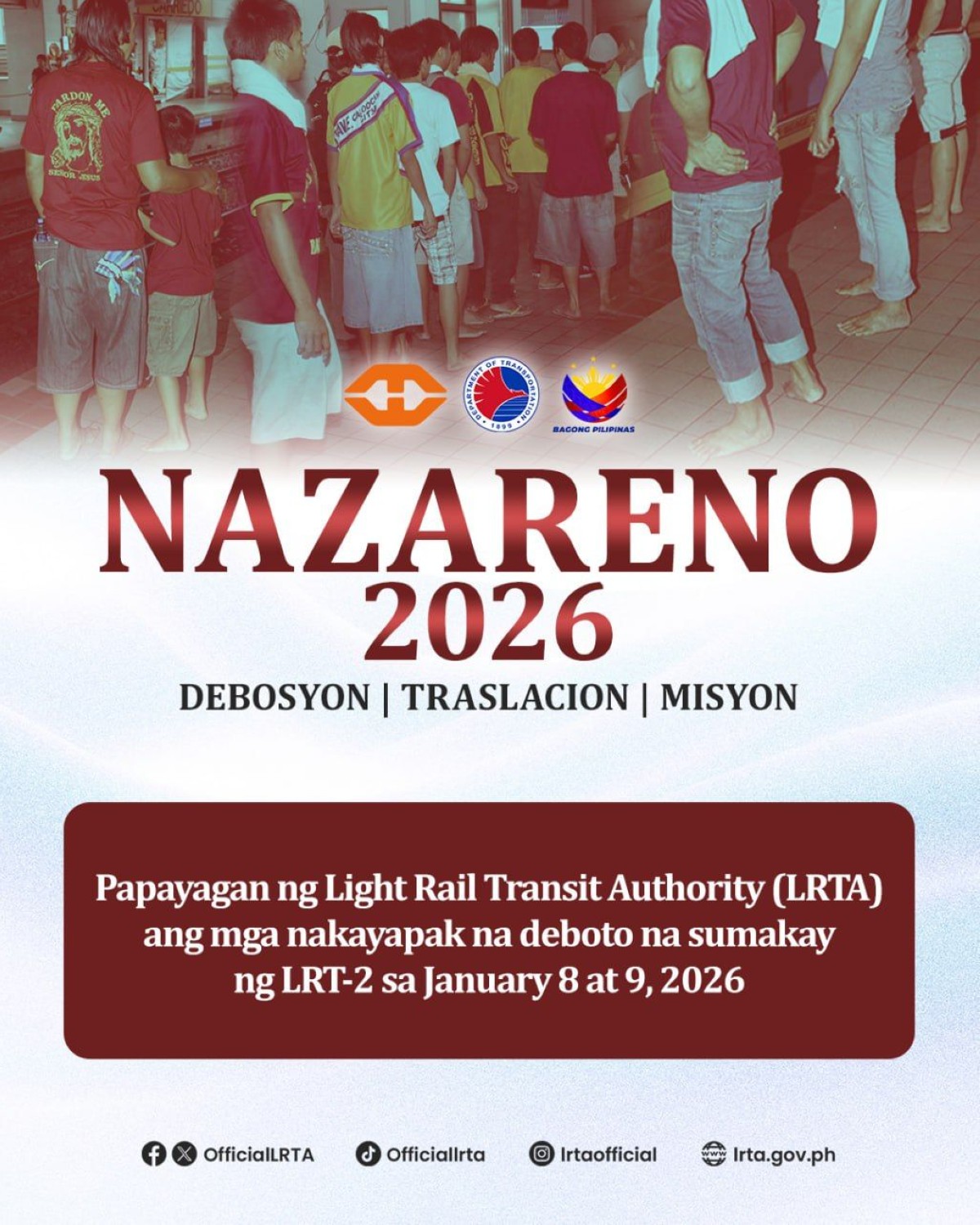 “Bilang pakikiisa sa Kapistahan ng Poong Nazareno, papayagan ang mga debotong nakayapak na makikibahagi sa Traslacion ng Itim na Nazareno na sumakay sa LRT Line 2 sa Enero 8-9, 2026,” anang LRT-2.