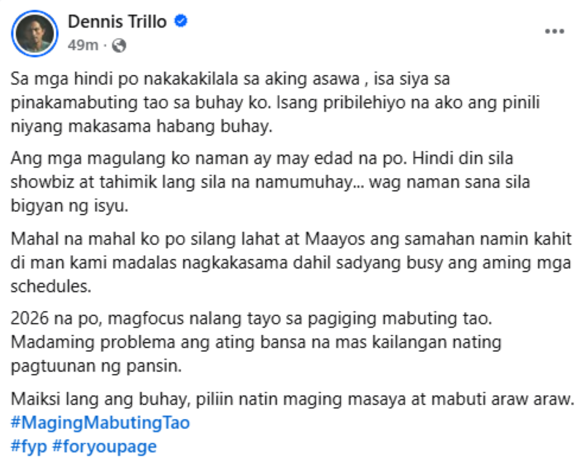 "2026 na po, magfocus nalang tayo sa pagiging mabuting tao. Madaming problema ang ating bansa na mas kailangan nating pagtuunan ng pansin. Maiksi lang ang buhay, piliin natin maging masaya at mabuti araw araw," aniya pa.