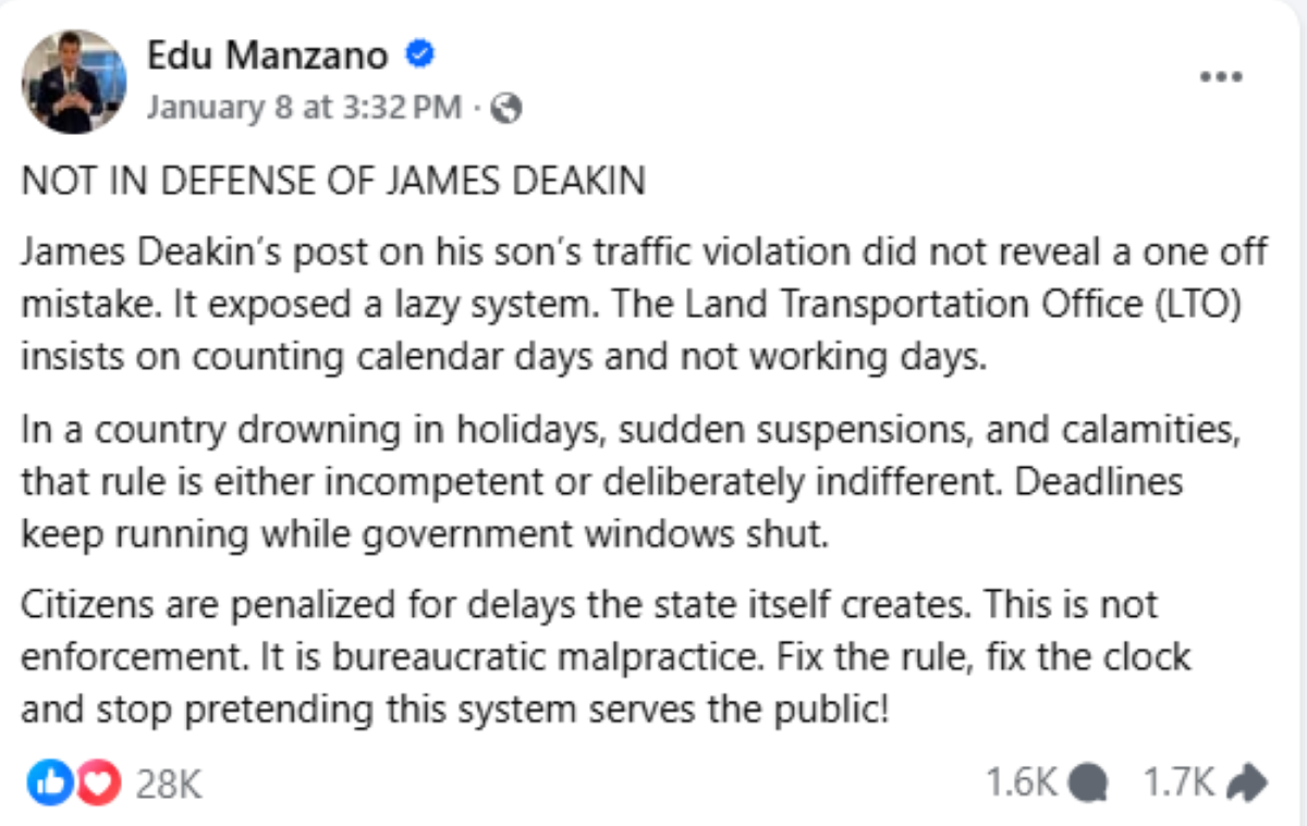 "James Deakin’s post on his son’s traffic violation did not reveal a one off mistake. It exposed a lazy system. The Land Transportation Office (LTO) insists on counting calendar days and not working days."