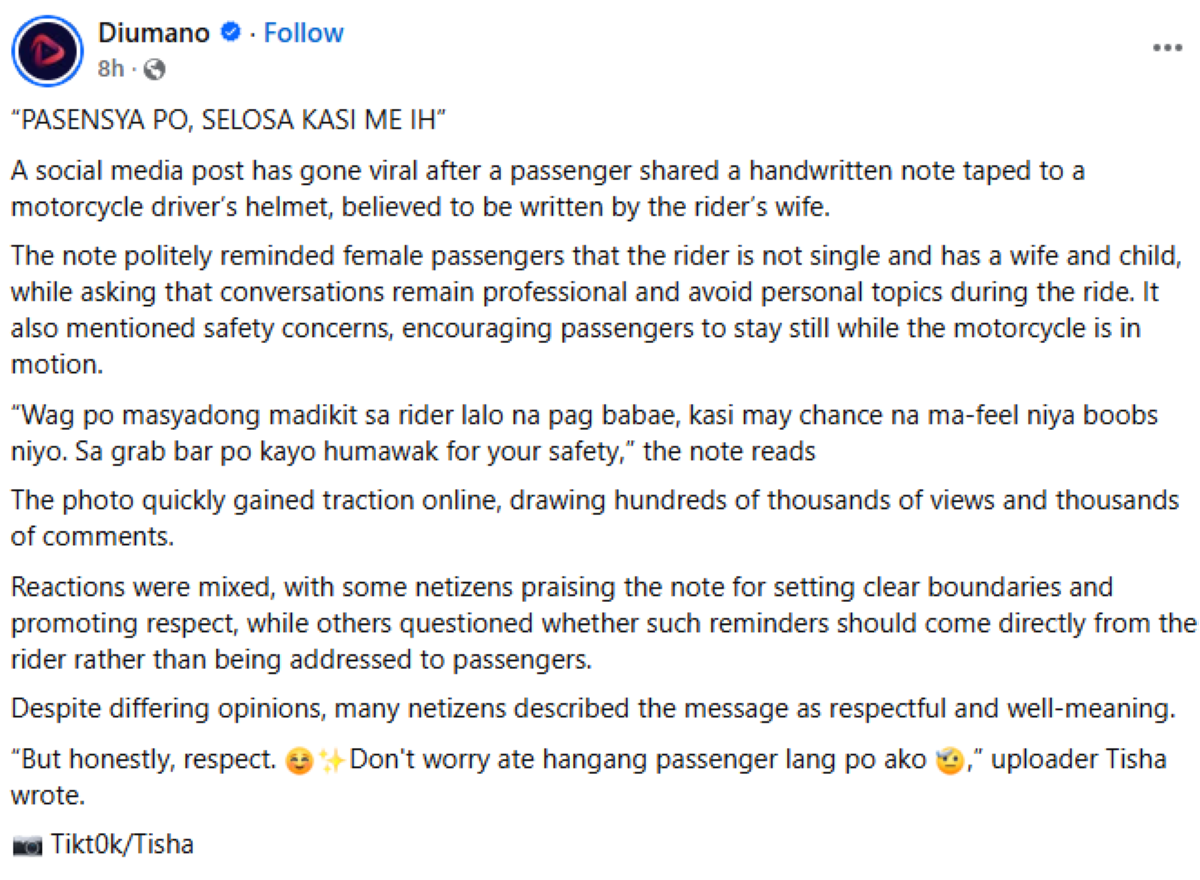 Viral ngayon sa social media ang isang larawan ng helmet ng isang motorcycle rider na may nakadikit na handwritten note, na umano’y iniwan ng kaniyang asawa bilang paalala para sa mga babaeng pasahero.