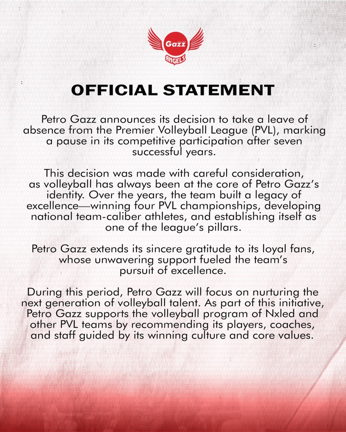 “Petro Gazz announces its decision to take a leave of absence from the Philippine Volleyball League (PVL), marking a pause in its competitive participation after seven successful years,” panimula ng PGA.