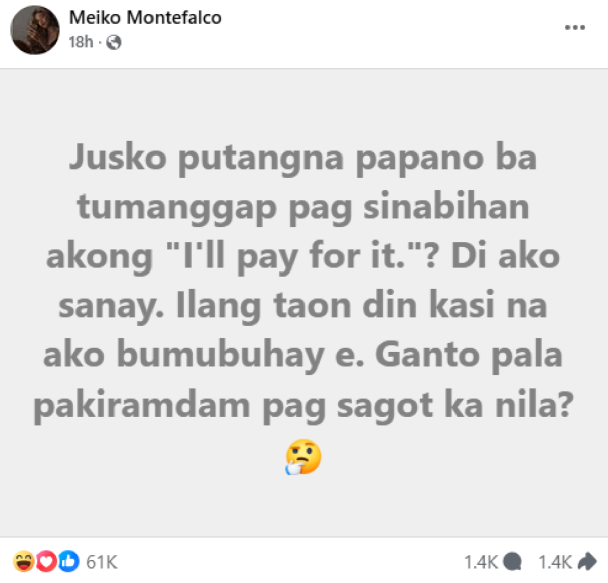 Usap-usapan ang tila pasaring ng social media personality na si Meiko Montefalco sa isang taong "matagal na raw niyang binubuhay" kaya hindi na raw siya sanay masabihang "I'll pay for it" ng hindi tinukoy na indibidwal.
