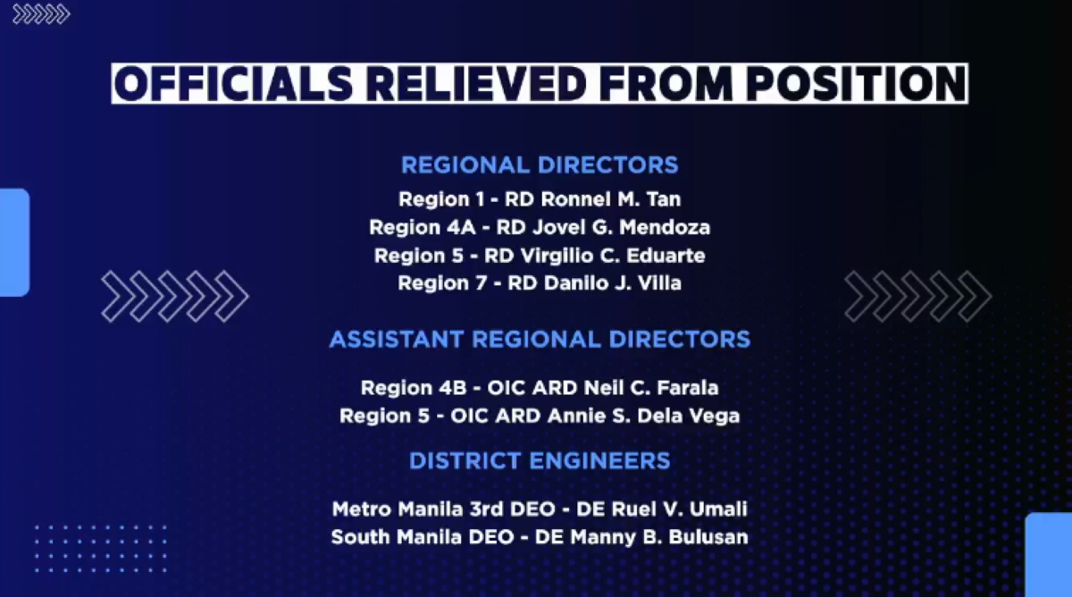 Ang mga sinibak sa puwesto ay binubuo ng apat na regional directors (RD), dalawang assistant regional directors (ARD), at dalawang district engineers (DE).