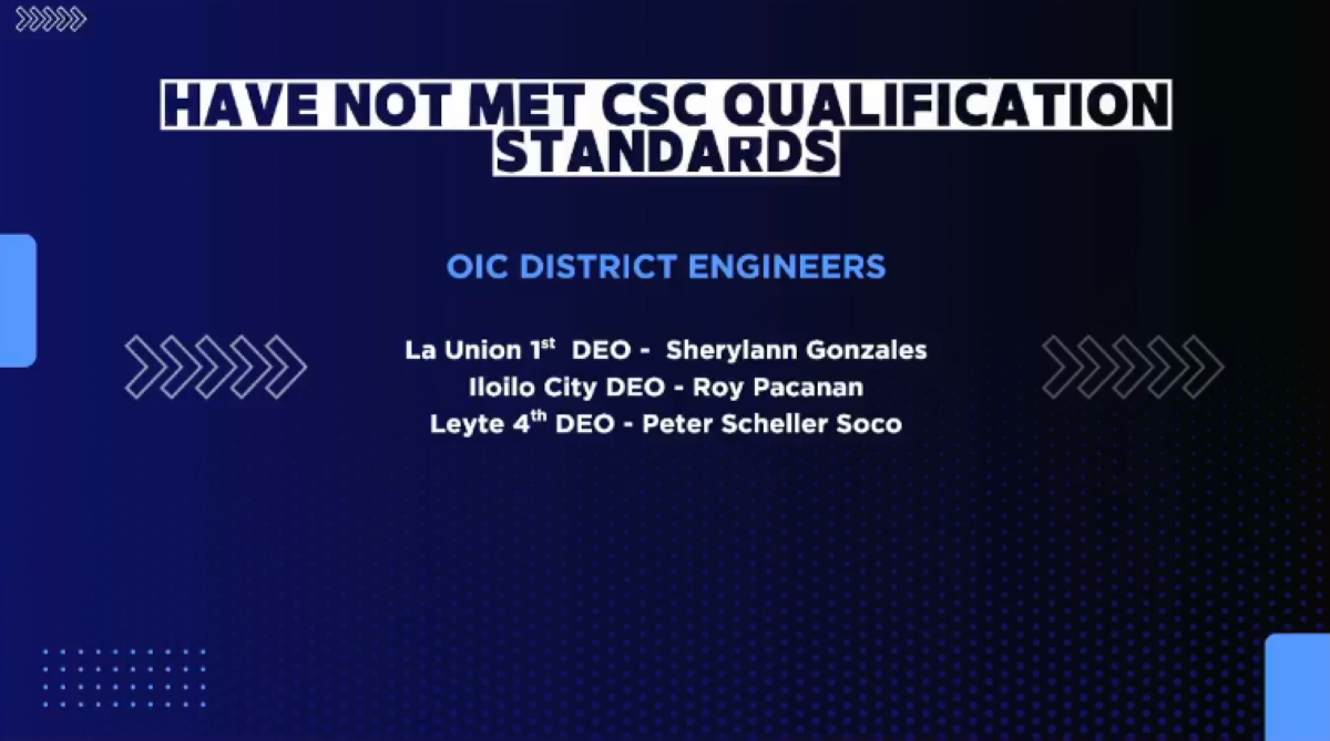 Kasama rin sa anunsyo ni Dizon ang pagtanggal sa OIC district engineers dahil sa hindi pagpasa sa mga kwalipikasyon ng Civil Service Commission (CSC).