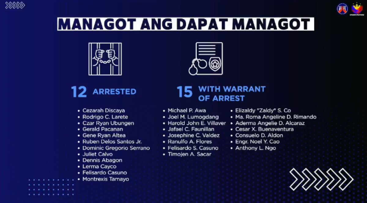 Sa kaniya ring latest update, mayroon nang 12 na naaresto dahil sa kaugnayan nila sa mga anomalya sa flood control projects at 15 na binabaan ng warrant of arrest.