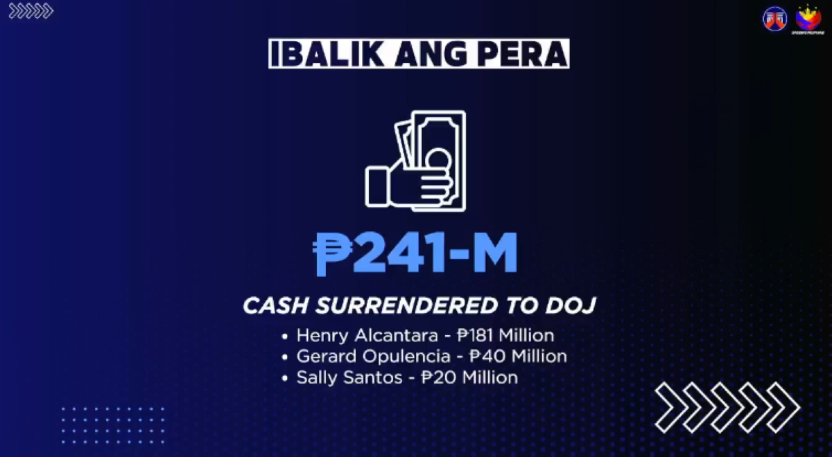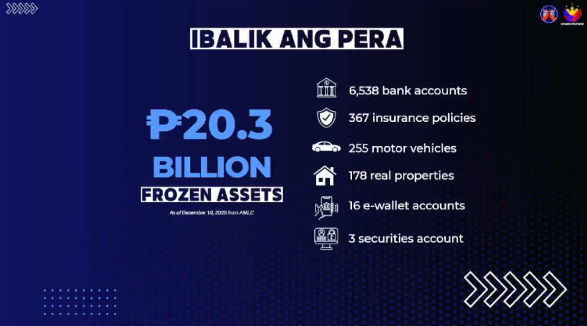 Habang ₱241 milyon naman ang pera na naibalik sa Department of Justice at ₱20.3 bilyon ang halaga ng frozen assets as of December 19, 2025.