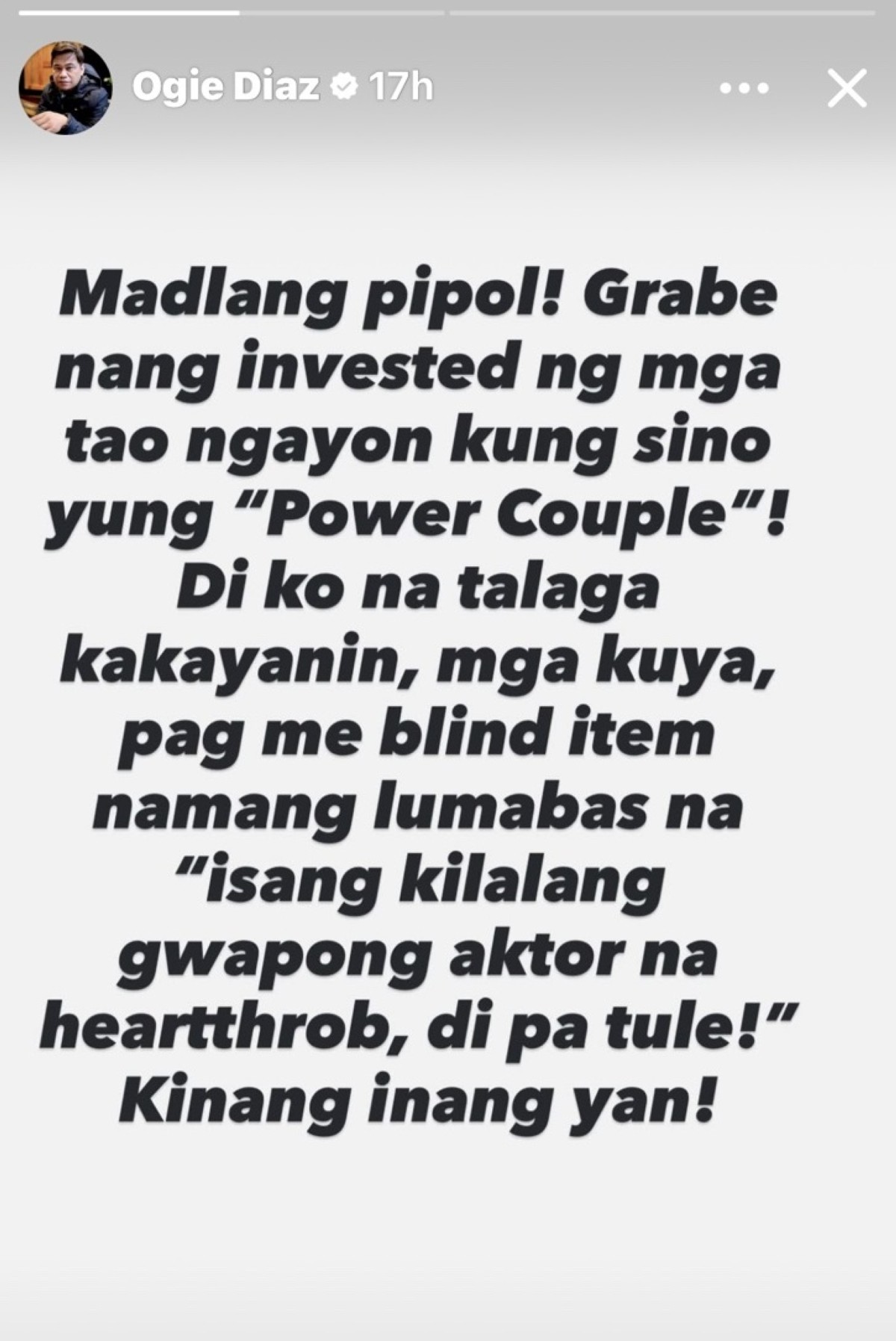 Sa naturang post, pabiro pero makahulugang pahayag ni Ogie na hindi pa nga raw nahuhulaan kung sino ang power couple, heto't nagbukas naman siya ng isa pang blind item tungkol sa isang kilalang guwapong aktor.