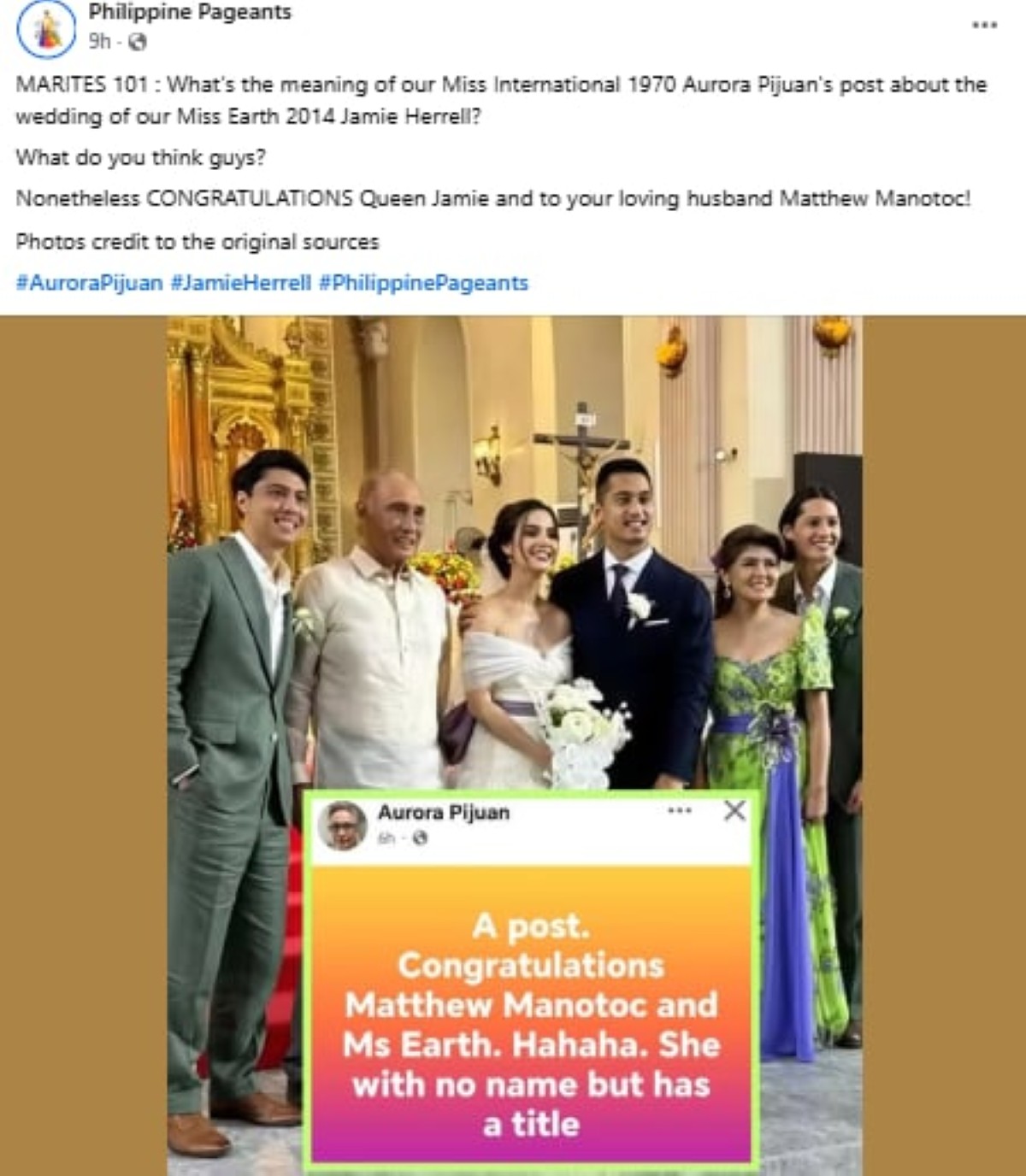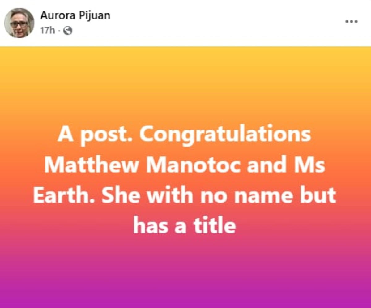 “A post. Congratulations Matthew Manotoc and Ms Earth. She with no name but has a title,” saad ni Aurora sa kaniyang post.