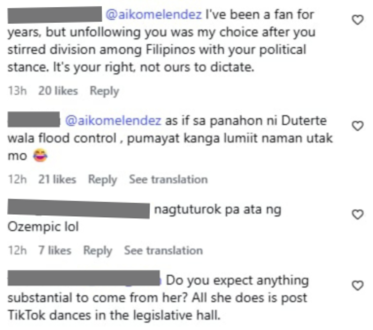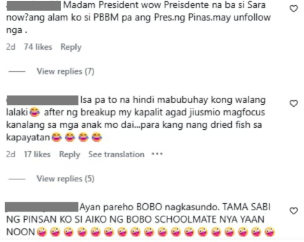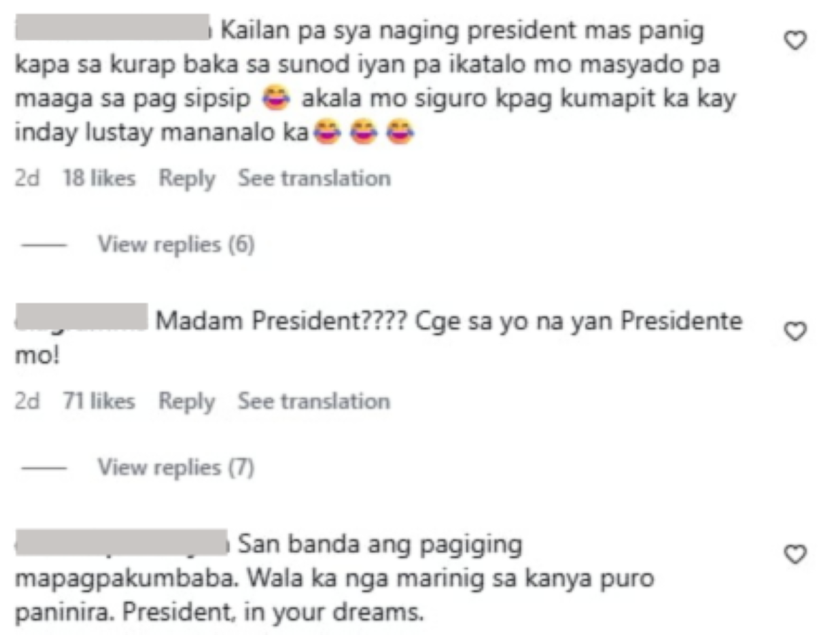 Mababasa naman sa kaniyang latest Instagram (IG) post ang mga naging komento ng netizens hinggil sa pagbisita niya sa opisina ng Pangalawang Pangulo.