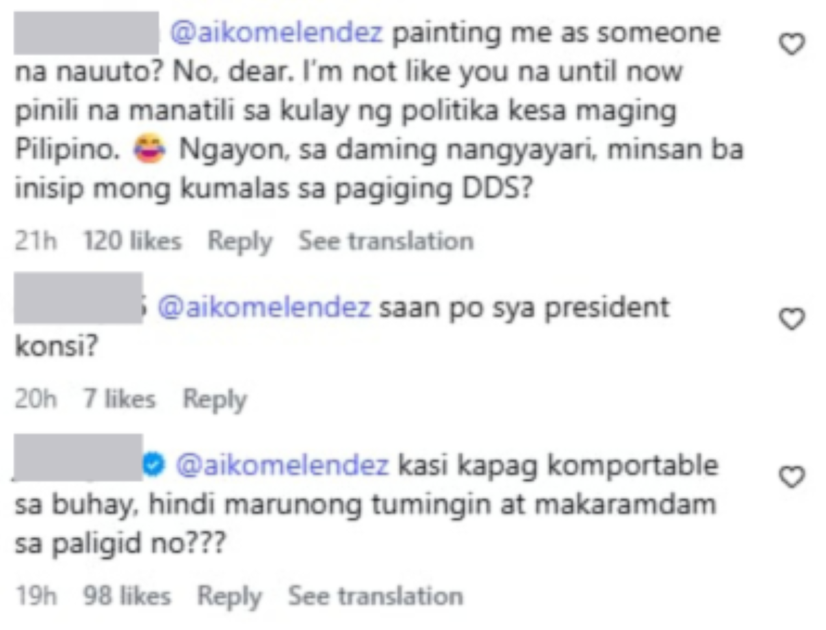 “Kons @aikomelendez BILIB AKO LALO SA TAPANG MO SA PANINIWALA SA ISANG @indaysaraduterte ALAM NAMAN NATIN SA SHIWBIZ .. HATI ang mga Paniniwala ! SALAMAT PO KONS.”