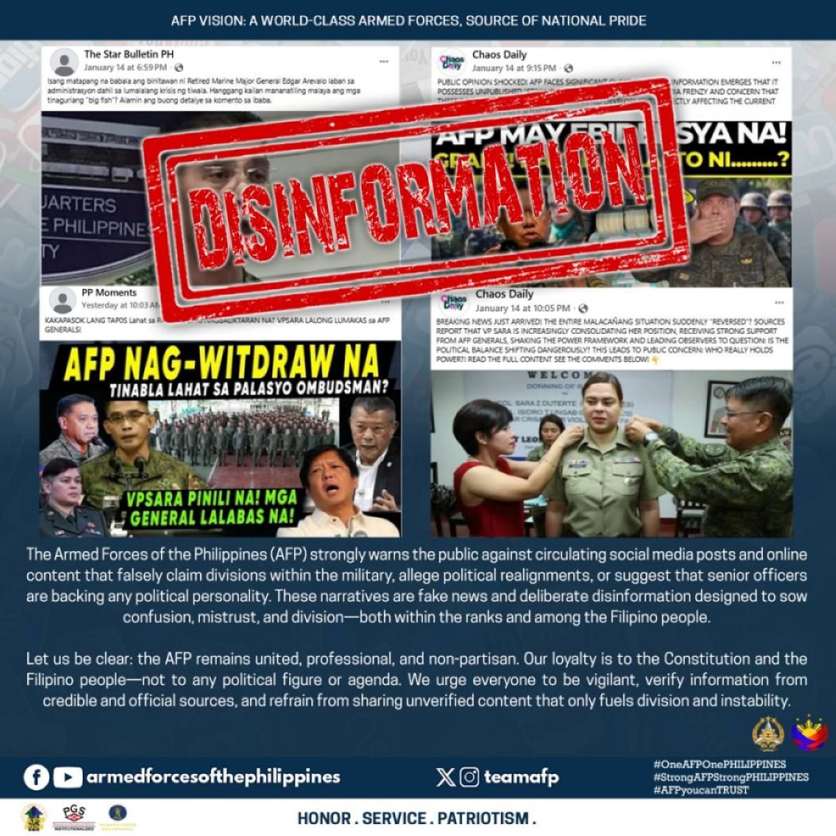Pinaalalahanan ng Armed Forces of the Philippines (AFP) ang publiko hinggil sa kumakalat na “fake news” kaugnay sa umano’y dibisyon at “realignments” sa politika ng bansa.