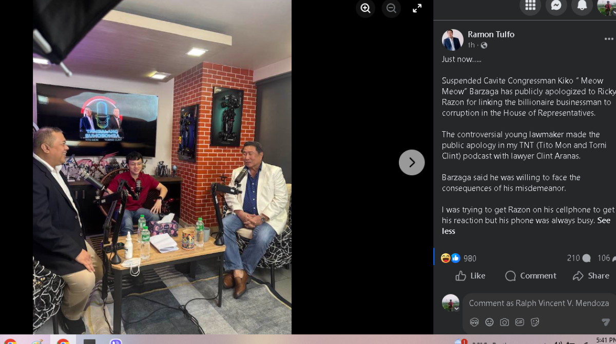 “The controversial young lawmaker made the public apology in my TNT (Tito Mon and Torni Clint) podcast with lawyer Clint Aranas,” saad ni Tulfo sa caption.