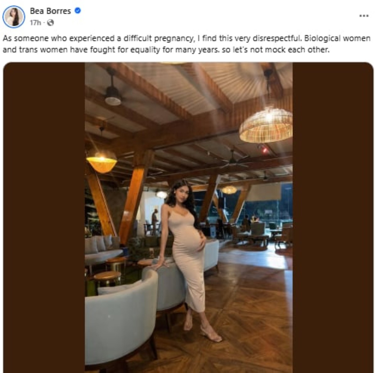 “As someone who experienced a difficult pregnancy, I find this very disrespectful. Biological women and trans women have fought for equality for many years. so let’s not mock each other,” komento ni Bea.