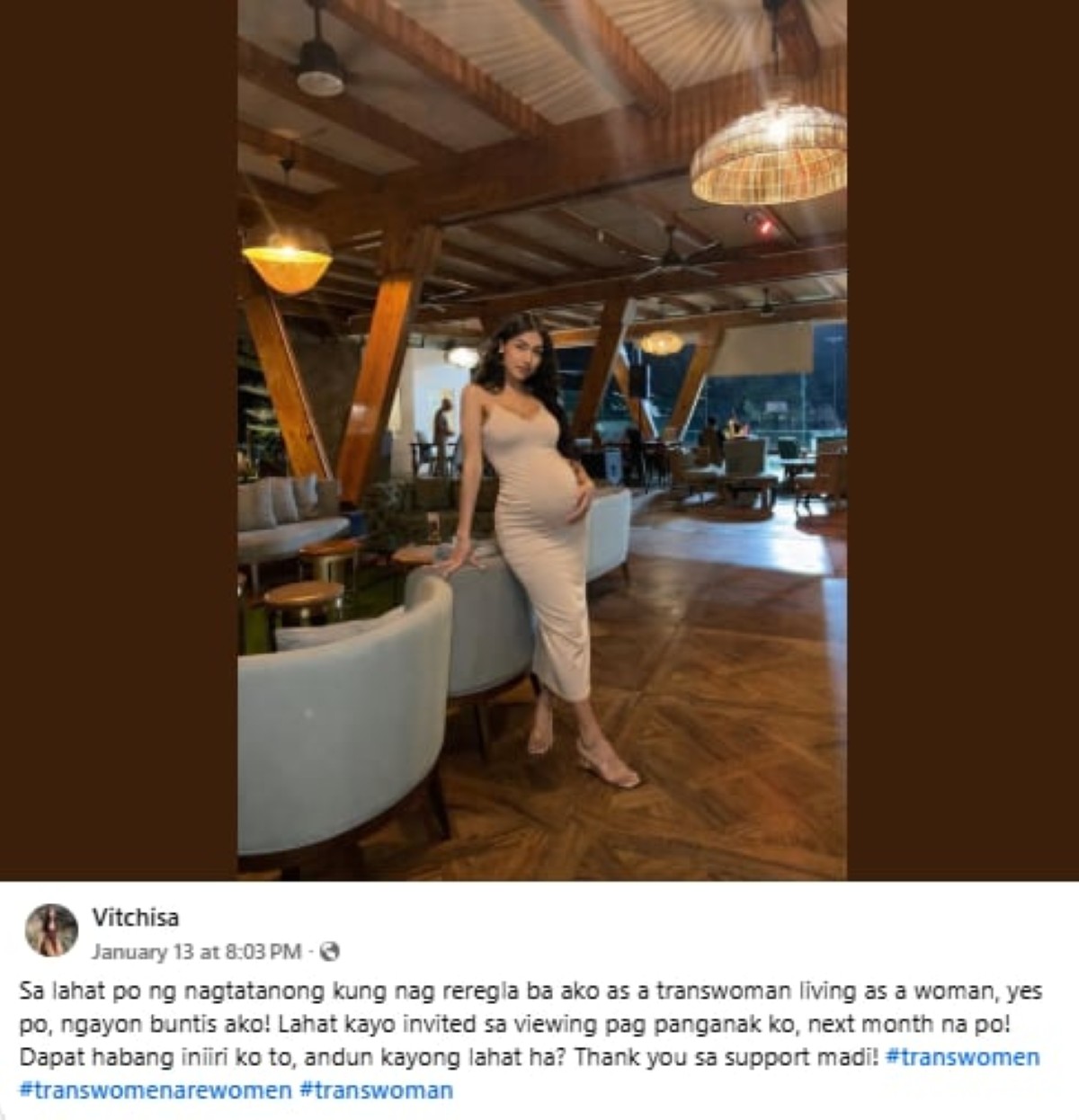 “Sa lahat po ng nagtatanong kung nag reregla ba ako as a transwoman living as a woman, yes po, ngayon buntis ako! Lahat kayo invited sa viewing pag panganak ko, next month na po! Dapat habang iniiri ko to, andun kayong lahat ha? Thank you sa support madi! #transwomen #transwomenarewomen #transwoman,” saad sa post.