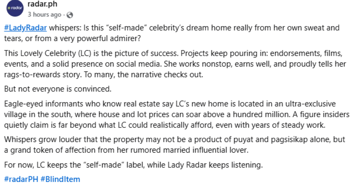 Sunod naman, lumabas ang isang blind item mula sa isang bagong news and media page tungkol sa isang lovely celeb.
