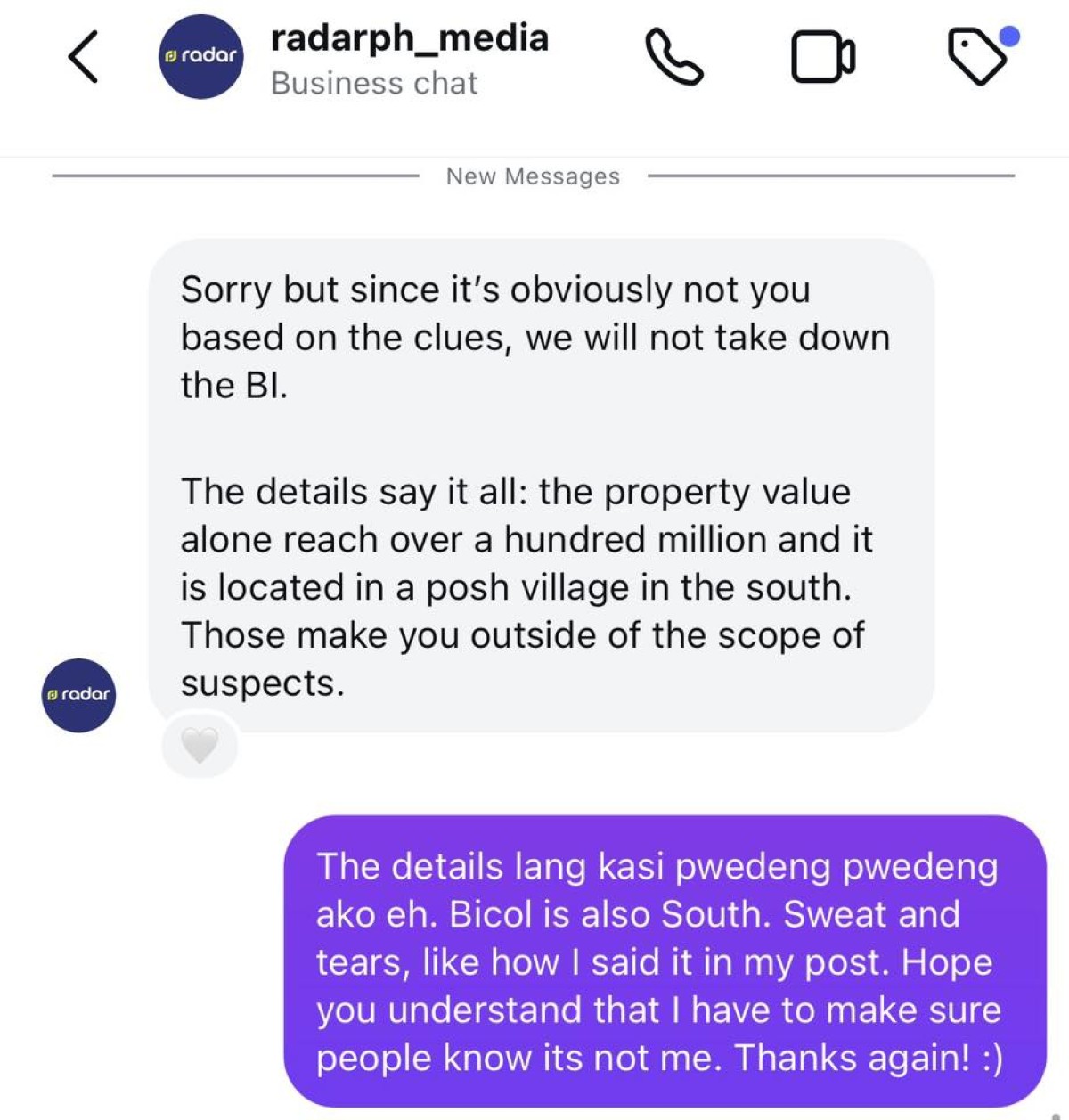 "Sorry but since it’s obviously not you based on the clues, we will not take down the BI. The details say it all: the property value alone reach over a hundred million and it is located in a posh village in the south. Those make you outside of the scope of suspects," mababasa mula sa admin ng page.