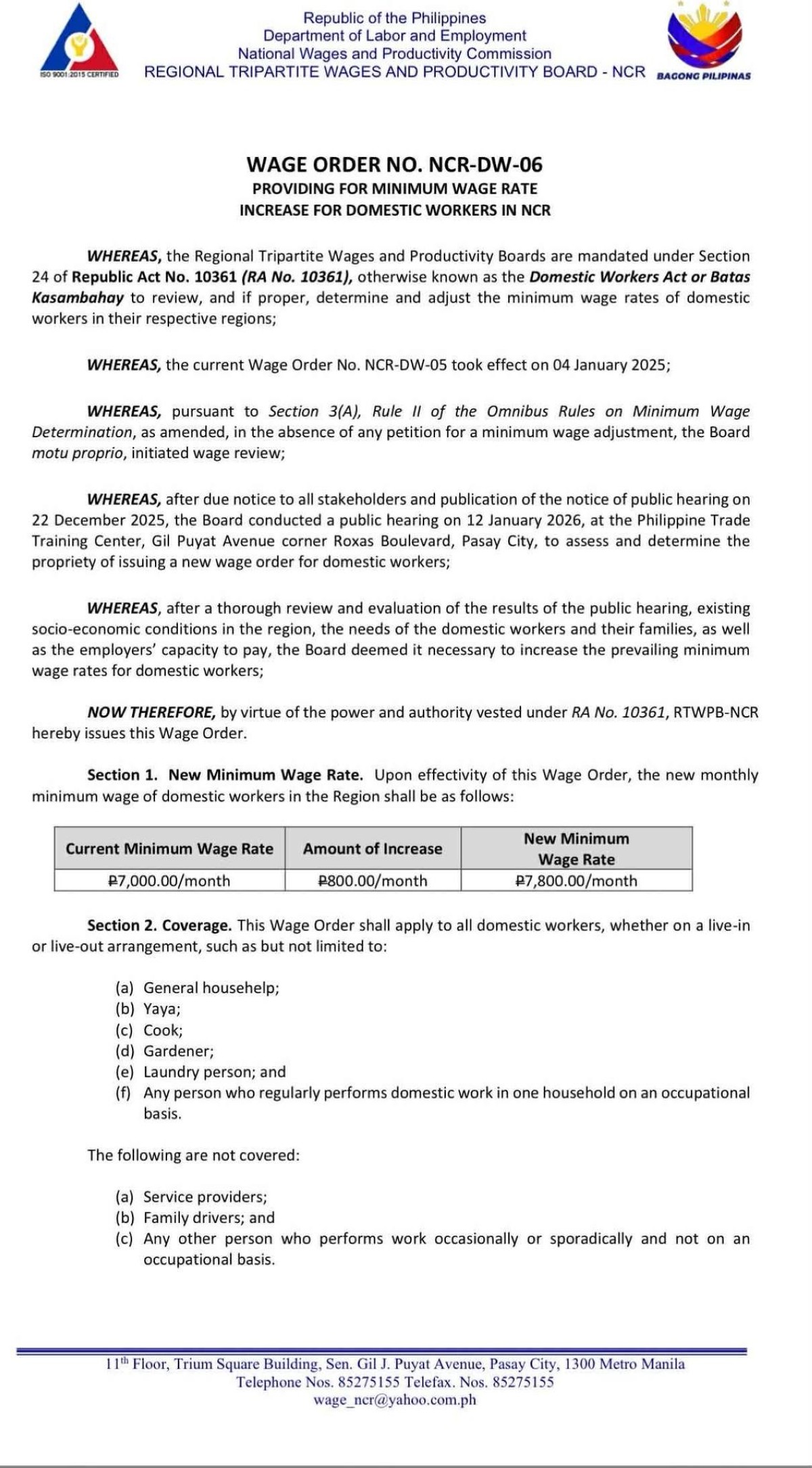 Nasasaad sa Wage Order No. NCR-DW-06 na mula sa ₱7,000 kada buwang minimum wage rate ng mga kasambahay, ito ay magiging ₱7,800 na kada buwan.