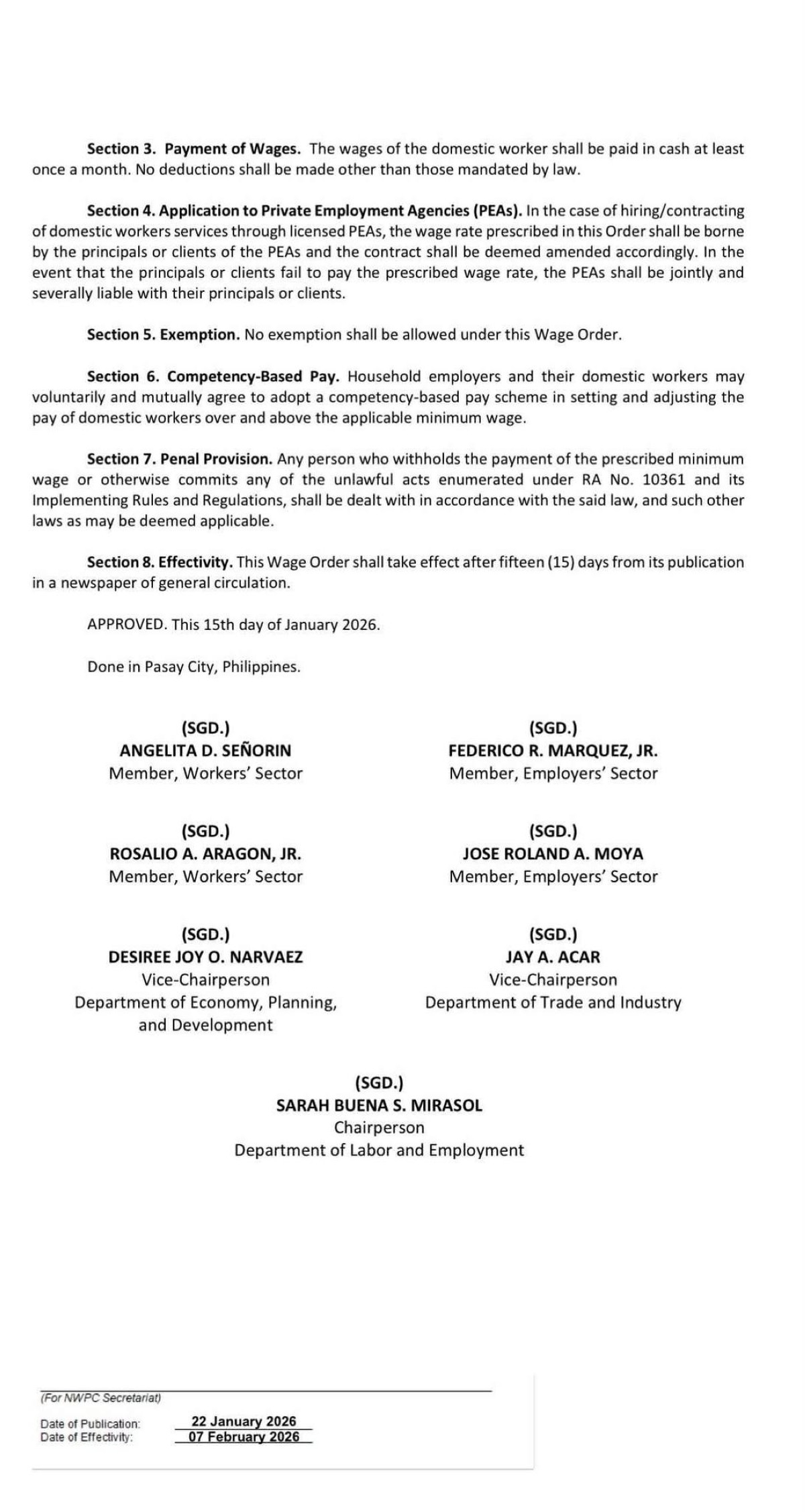 Inaprubahan ang wage order noong Enero 15, 2026, at inaasahang magiging epektibo sa Pebrero 7, 2026.