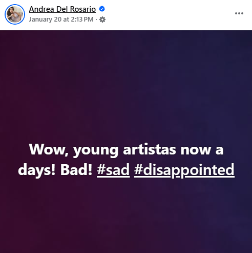 Usap-usapan ang naging tila pagkadismaya ng aktres na si Andrea Del Rosario sa "young artistas" o batang henerasyon ng mga artista sa kasalukuyan.