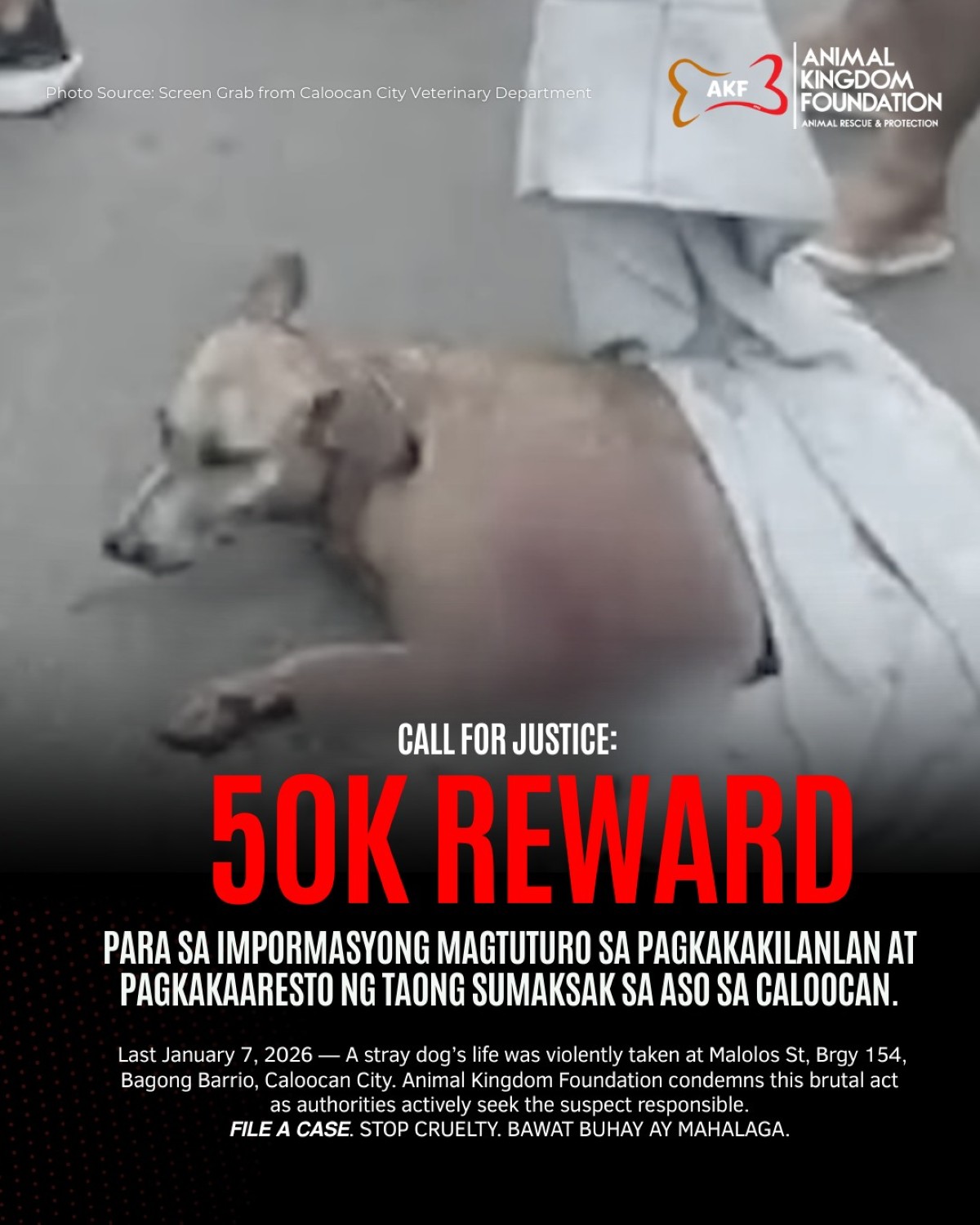 Magbabahagi ng pabuyang aabot sa ₱50,000 ang Animal Kingdom Foundation (AKF) sa makapagbibigay ng impormasyon patungkol sa meat vendor na pumatay sa isang aspin sa Caloocan City kamakailan.