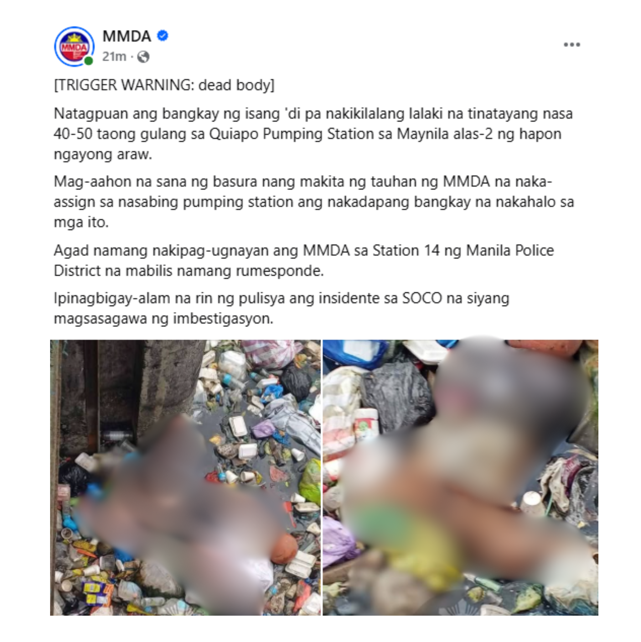 Ayon ulat ng Metropolitan Manila Development Authority (MMDA), tinatayang nasa 40 hanggang 50 taong gulang ang nasabing bangkay na natagpuang nakadapa sa mga basura sa Quiapo Pumping Station.