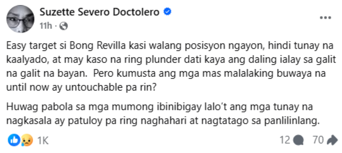 Sa kaniyang Facebook post nitong Sabado, Enero 24 ng madaling-araw, iginiit ni Doctolero na naging “madaling target” si Revilla dahil wala na itong hawak na posisyon sa gobyerno, hindi umano kabilang sa tunay na hanay ng mga makapangyarihang kaalyado, at dati nang nasangkot sa kasong plunder.