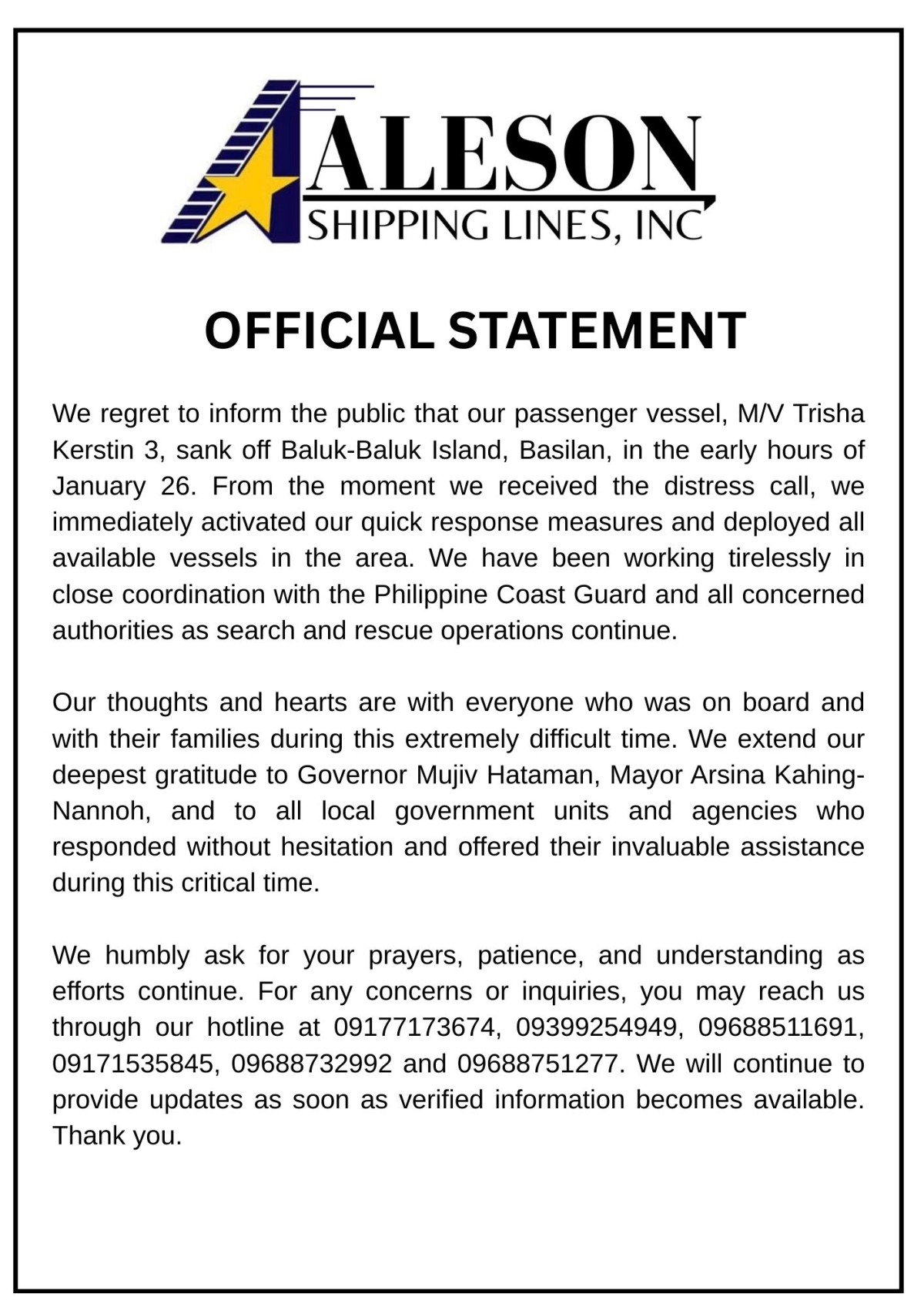 Ipinabatid din nila ang pagpapasalamat sa local government units at mga ahensya, partikular kina Gov. Mujiv Hataman at Mayor Arsina Kahing-Nannoh na agad rumesponde at nagbigay ng tulong sa insidente ng paglubog ng M/V Trisha Kerstin 3, na may lulan na 332 pasahero at 27 crew members.