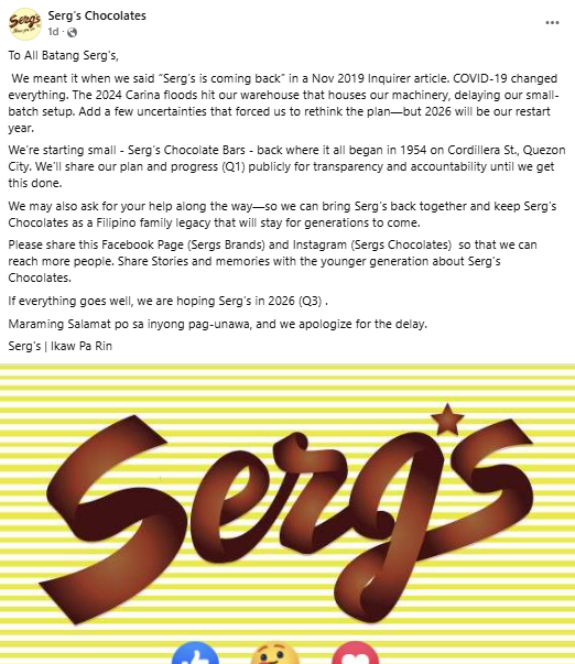 Kaya sa kasalukuyan, pakiusap nila sa publiko na tulungan ang Serg’s Chocolates at maipagpatuloy ang kanilang legasiya, sa pamamagitan ng pag-share ng kanilang social media pages, at pagbabahagi ng kanilang mga alaala kasama ang Serg’s Chocolates sa mga bagong henerasyon.