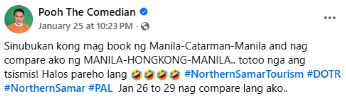 "Sinubukan kong mag book ng Manila-Catarman-Manila and nag compare ako ng MANILA-HONGKONG-MANILA.. totoo nga ang tsismis! Halos pareho lang, " ani Pooh.