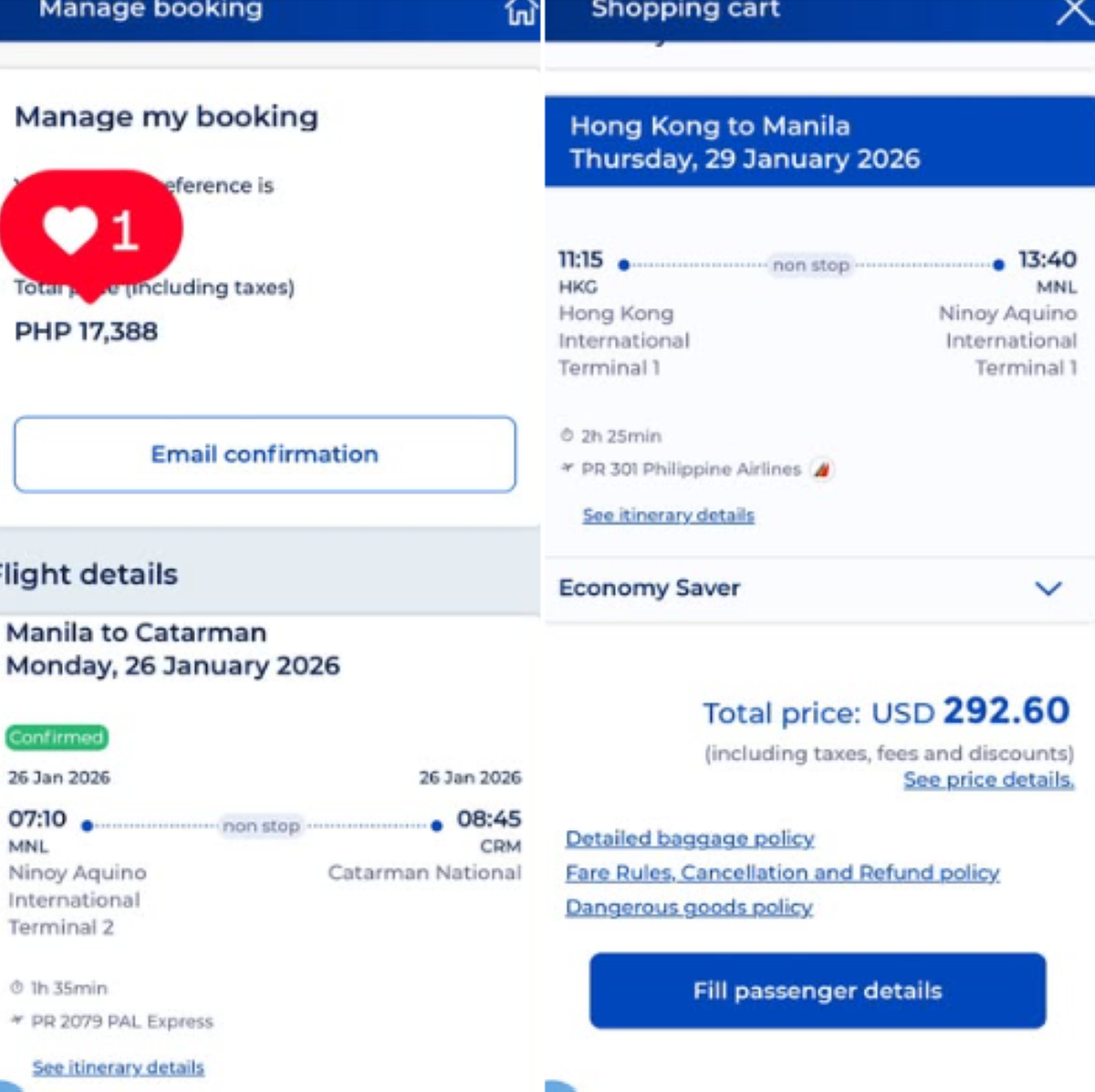 Samantala, sa isa pang screenshot, makikita na ang round-trip flight mula Maynila patungong Hong Kong at pabalik ng Maynila, na may biyahe noong Enero 29, 2026, ay nagkakahalaga lamang ng USD 292.60, o tinatayang halos kapantay ng domestic fare kapag kinonvert sa piso.