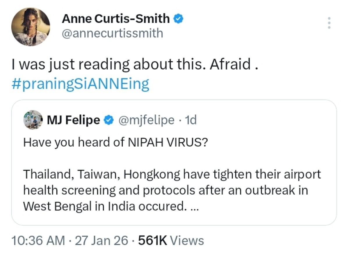 Tila naloka ang aktres at TV host na si Anne Curtis matapos makabasa ng ilang impormasyon kaugnay sa napapaulat na pagkalat ng “Nipah virus” sa iba’t ibang panig ng mundo.