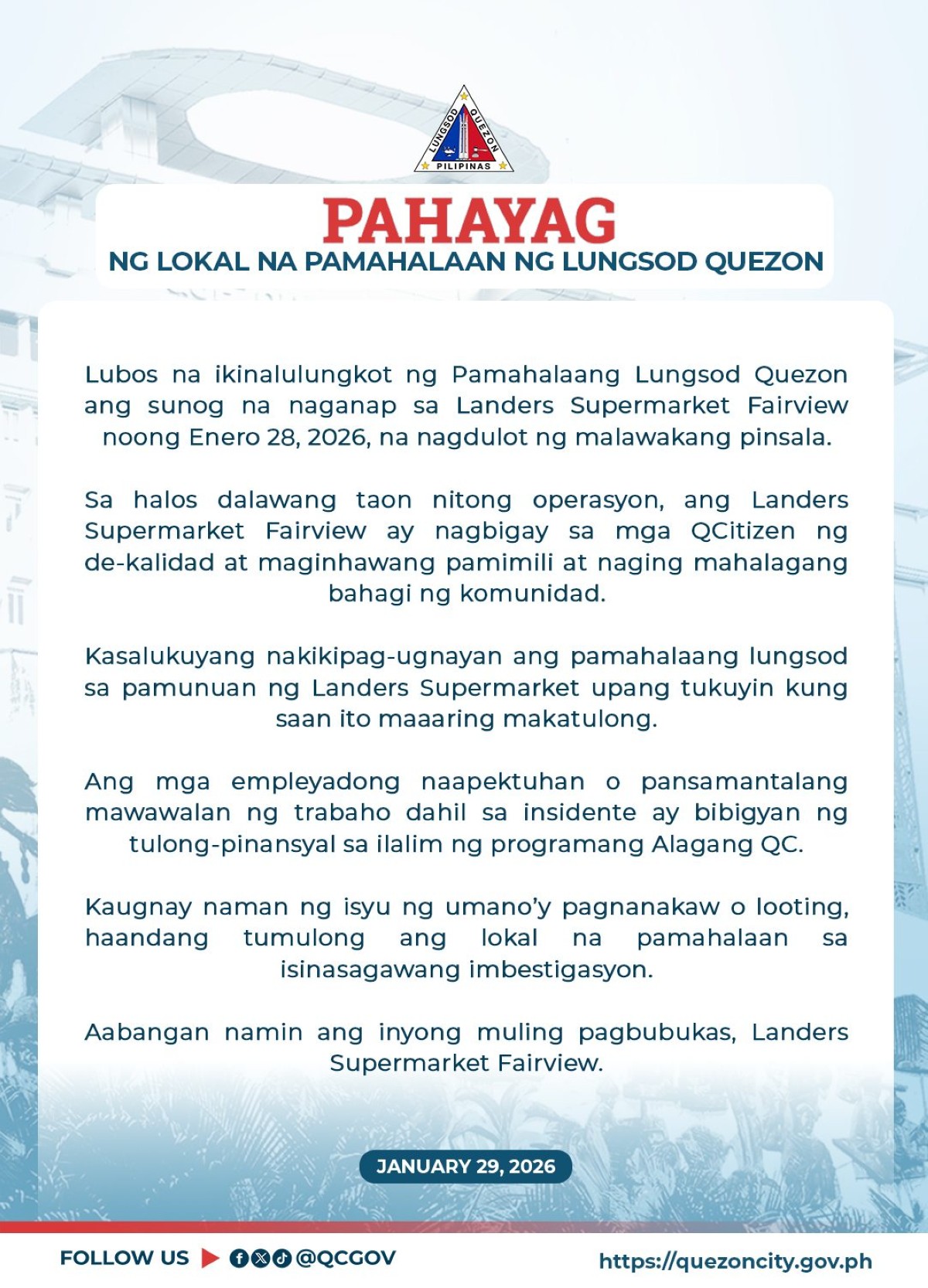Sa pahayag ng QC LGU sa social media nila nitong Huwebes, Enero 29, kinilala nito ang malawakang pinsala na naging dulot ng naganap na sunog sa Landers Supermarket Fairview noong Miyerkules, Enero 28.