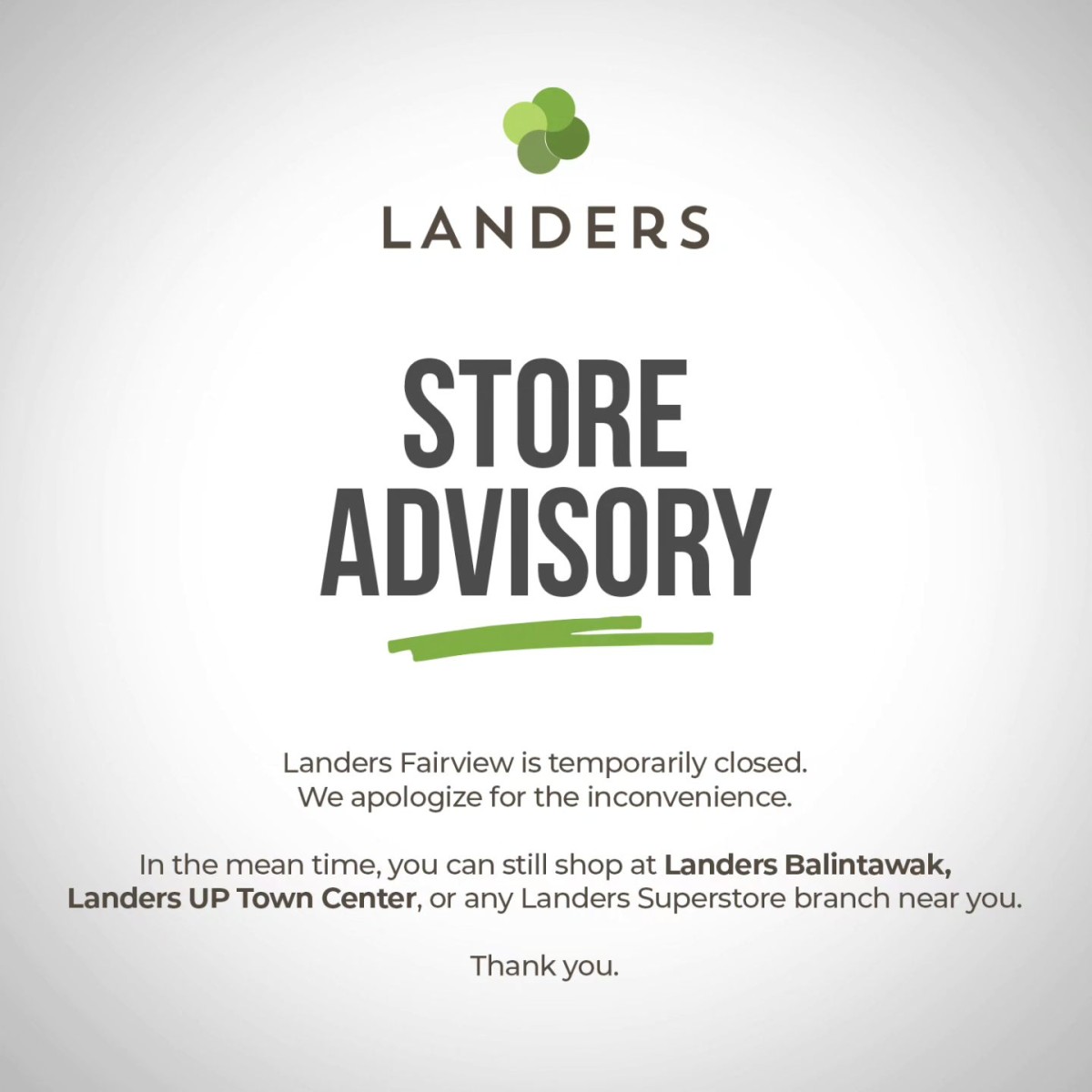 Sa kabilang banda, base sa inilabas na pahayag ng Landers Superstore noon ding Enero 28, pansamantala muna nilang isasara ang kanilang Fairview branch.
