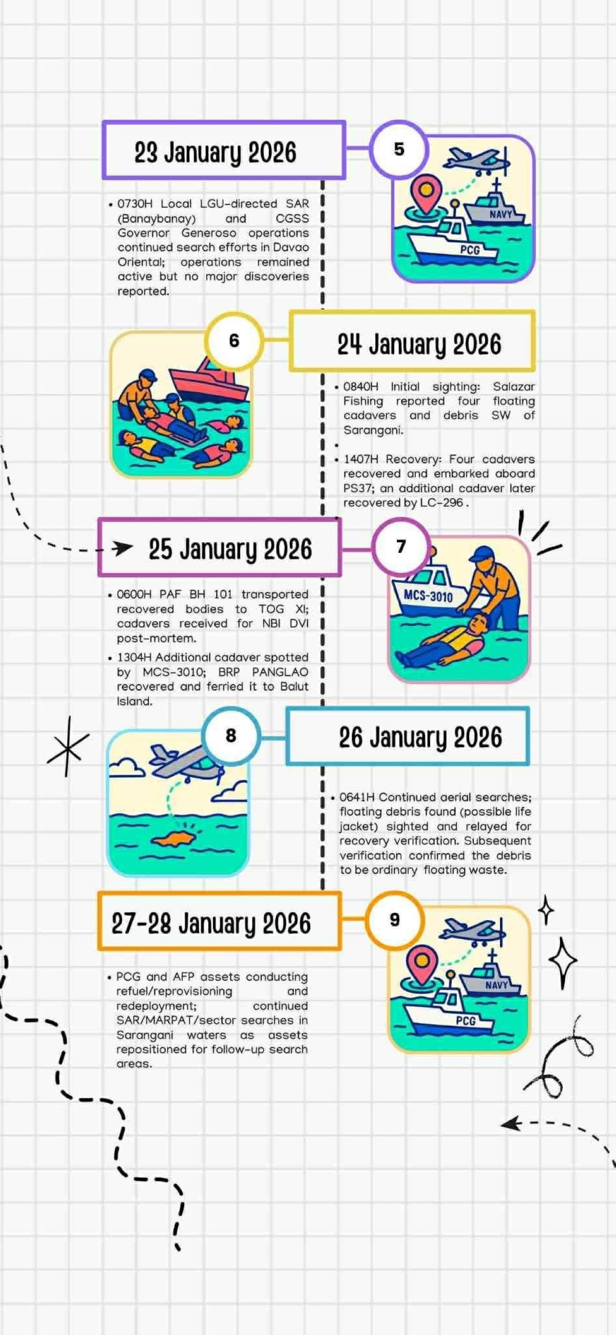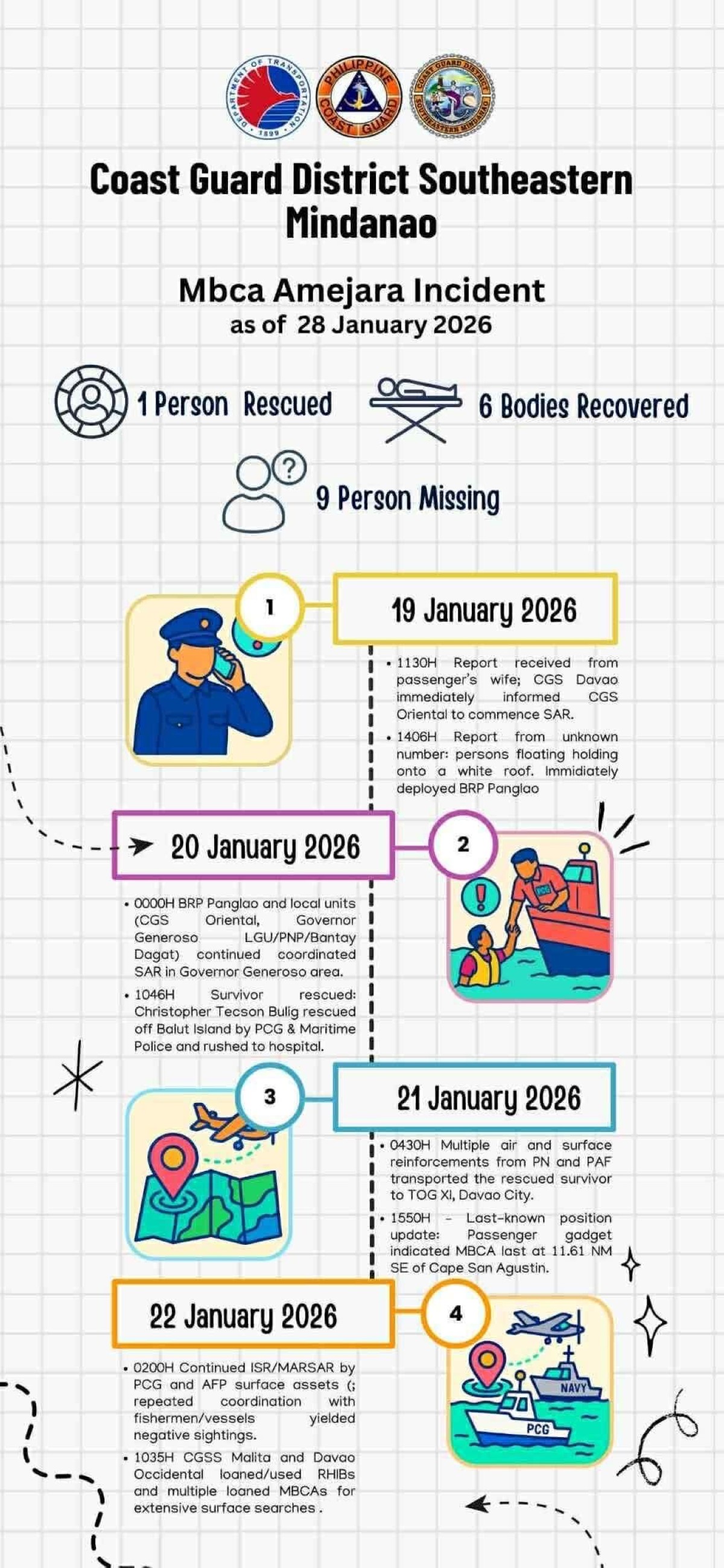 Una rito ay ang Enero 24, kung saan narekober ng mga awtoridad ang apat na labi mula sa MBCA Amejara, at Enero 26, Enero 28, at 29, kung saan tinukoy nila ang mga posibleng life jacket mula sa karagatan ng Saranggani.