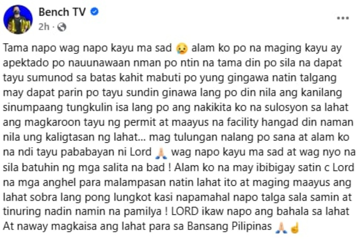 Sa isang social media post na ibinahagi ni BenchTV nitong Biyernes, Enero 30, mababasang sinabi niya na tama naman daw na dapat ay sumunod ang bawat isa sa batas.