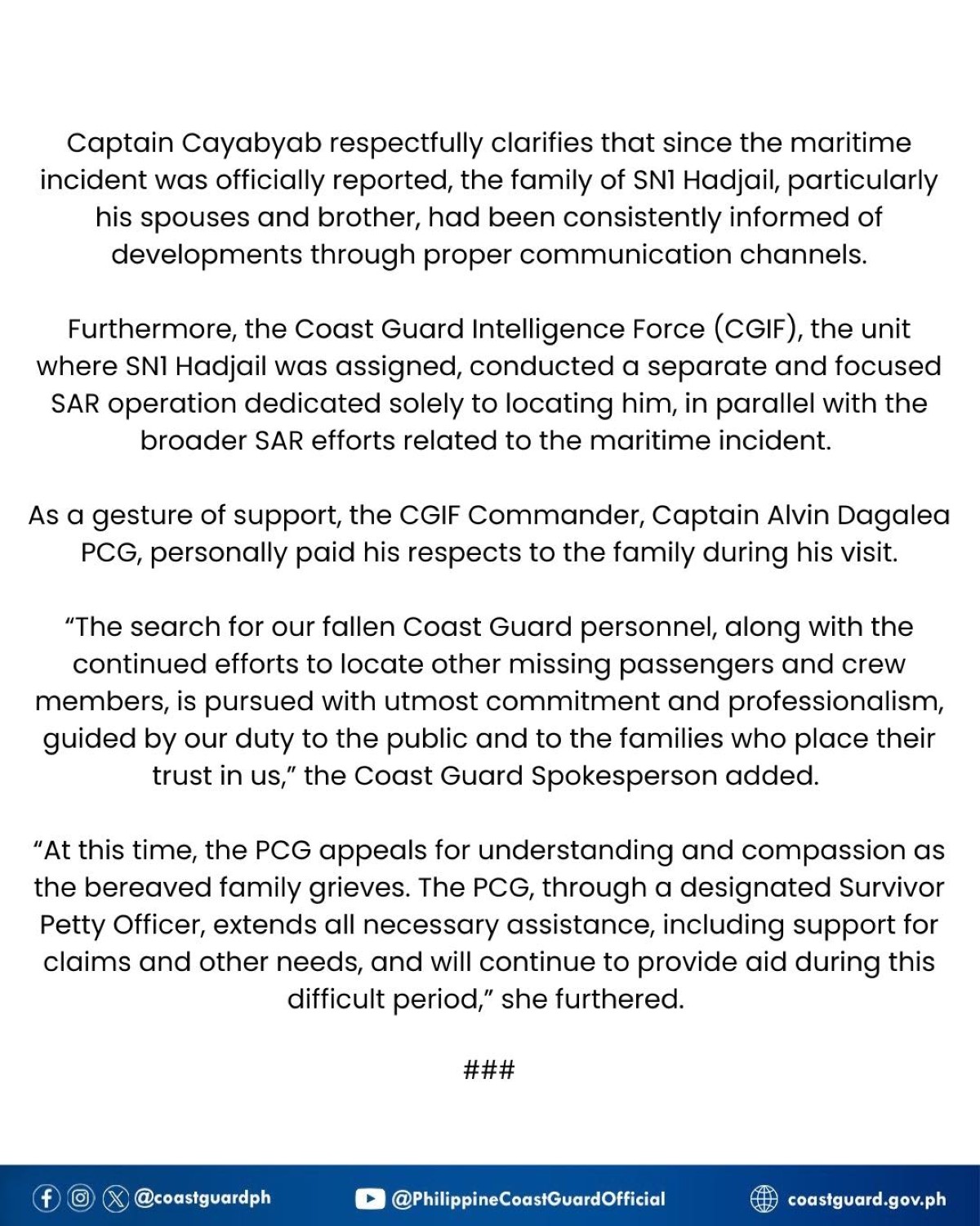 “Captain Cayabyab respectfully clarifies that since the maritime incident was officially reported, the family of SN1 Hadjail, particularly his spouses and brother, had been consistently informed of developments through proper communication channels,” paglilinaw ng PCG.