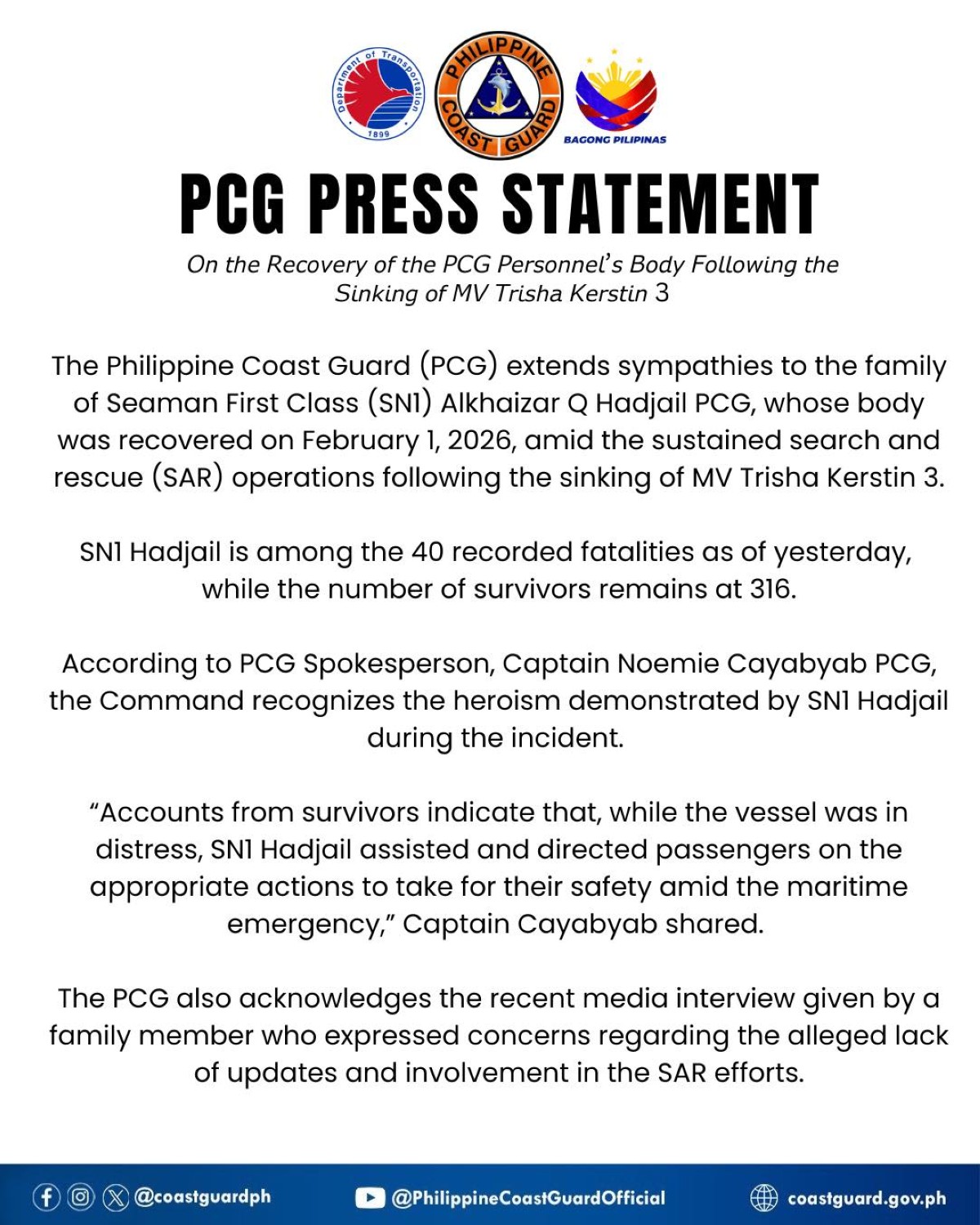 Sa kabilang banda, nilinaw naman ng PCG sa isa pang pahayag nitong Lunes, Pebrero 2, na naging maagap sila sa pagbibigay ng update sa mga kaanak ni SN1 Hadjail.