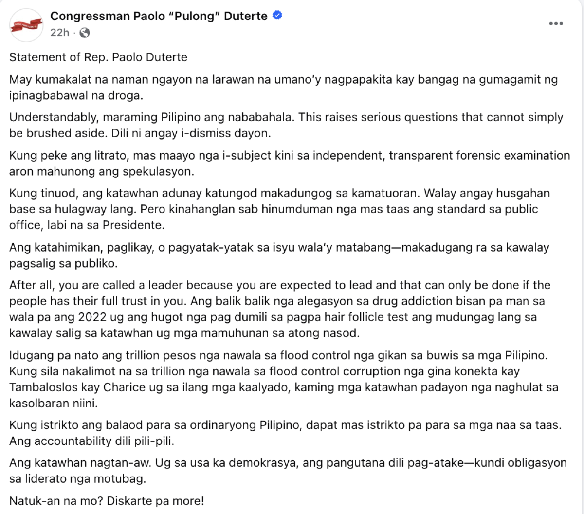 "May kumakalat na naman ngayon na larawan na umano’y nagpapakita kay bangag na gumagamit ng ipinagbabawal na droga," saad niya sa isang Facebook post nitong Lunes, Pebrero 2. "Understandably, maraming Pilipino ang nababahala. This raises serious questions that cannot simply be brushed aside. Dili ni angay i-dismiss dayon."