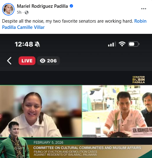 "Despite all the noise, my two favorite senators are working hard. Robin Padilla Camille Villar," mababasa sa caption ng post ni Mariel.
