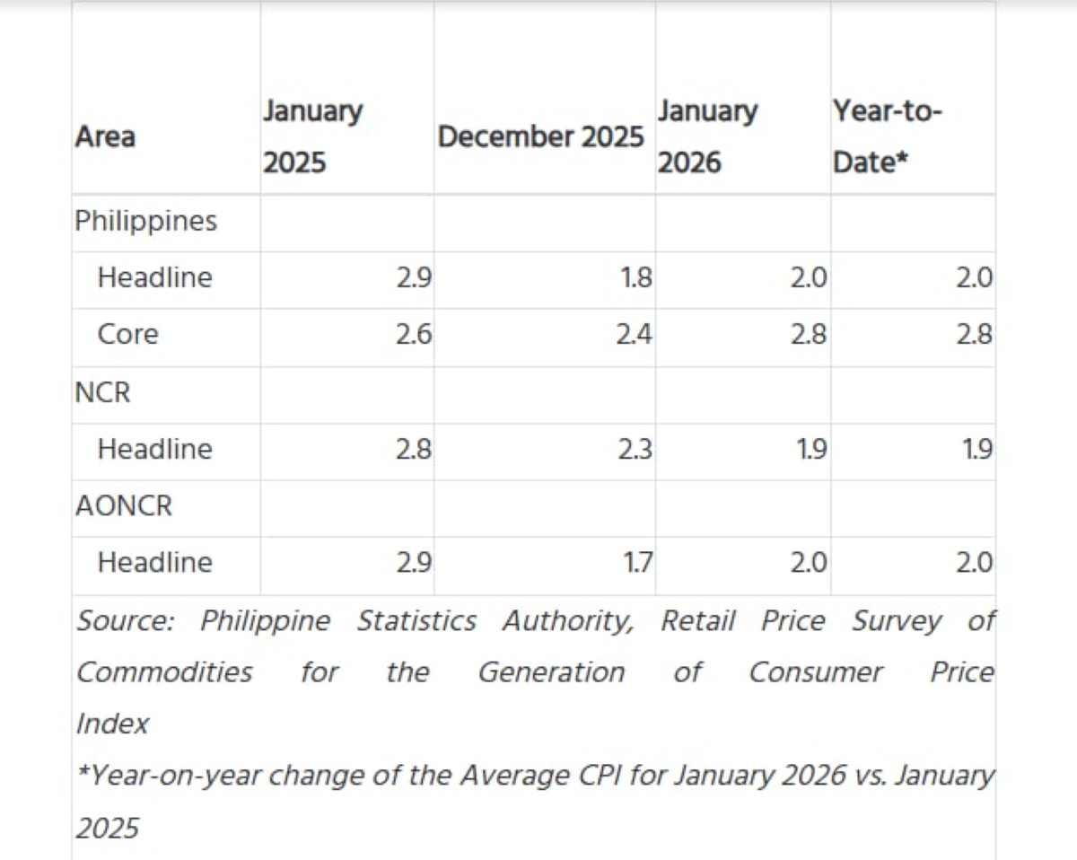 Sa mga lugar naman sa labas ng National Capital Region (NCR), bumaba ito sa 2.0% noong Enero 2026—mas mababa rin sa talang 2.9% sa parehong buwan noong nakaraang taon.