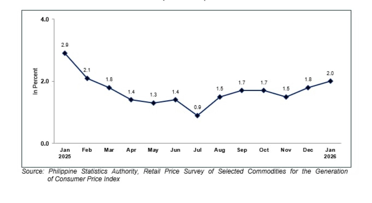 Naitala ng Philippine Statistics Authority (PSA) noong Enero 2026 ang 2.0% inflation rate sa bansa, o ang pagtaas ng presyo ng mga bilihin at iba’t ibang serbisyo.