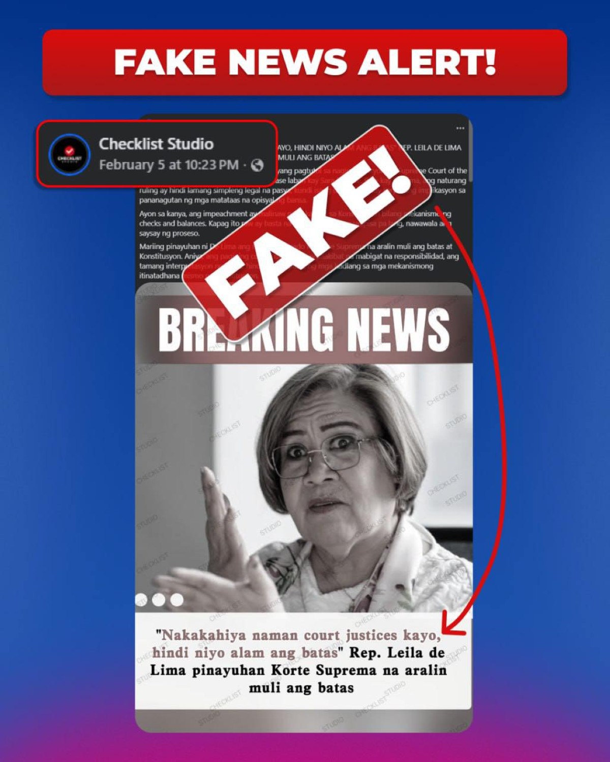 Kaugnay ito sa umano’y pagkalat ng malisyosong social media post kung saan sinabi raw ni De Lima na siya ay nahihiya dahil hindi alam ng “court justices” ang batas.